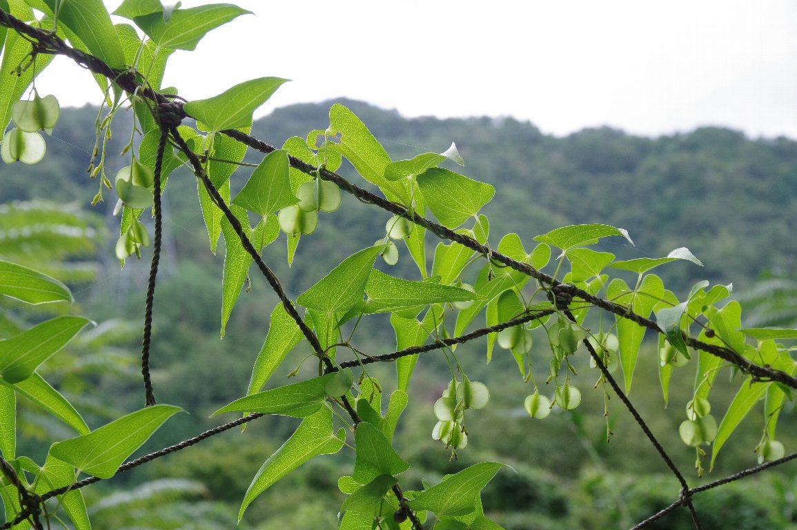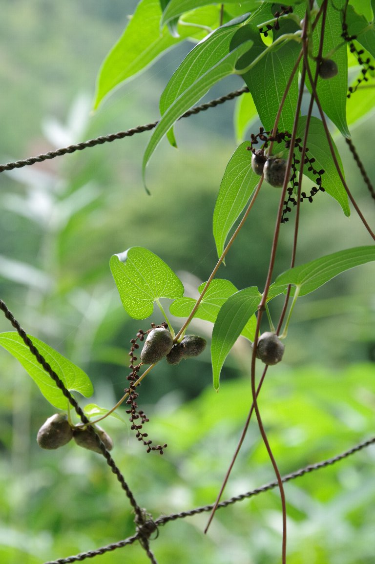 道ばたの網フェンスは、不法投棄防止用だろう。そこに、ヤマノイモの蔓が絡まっていた。 花は終わりかけで、実が生り始めている。 むかごも付いていて、花、実、むかごの競演になっていた。 |