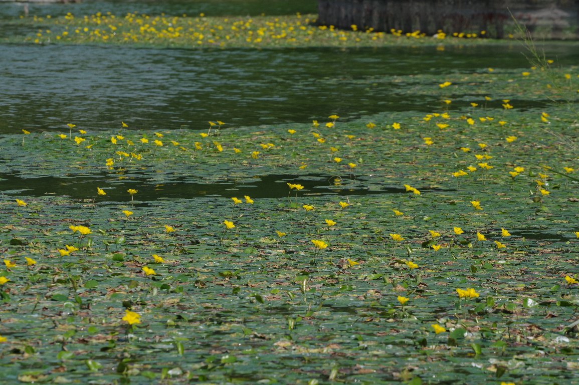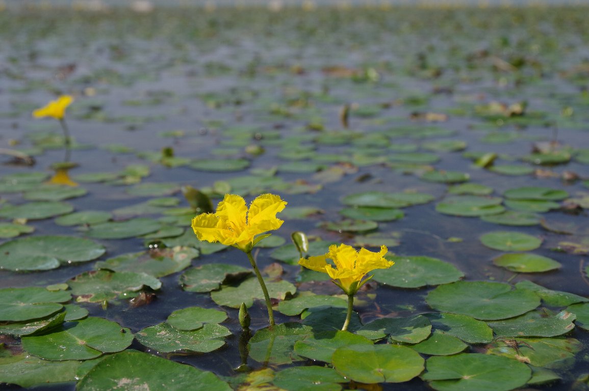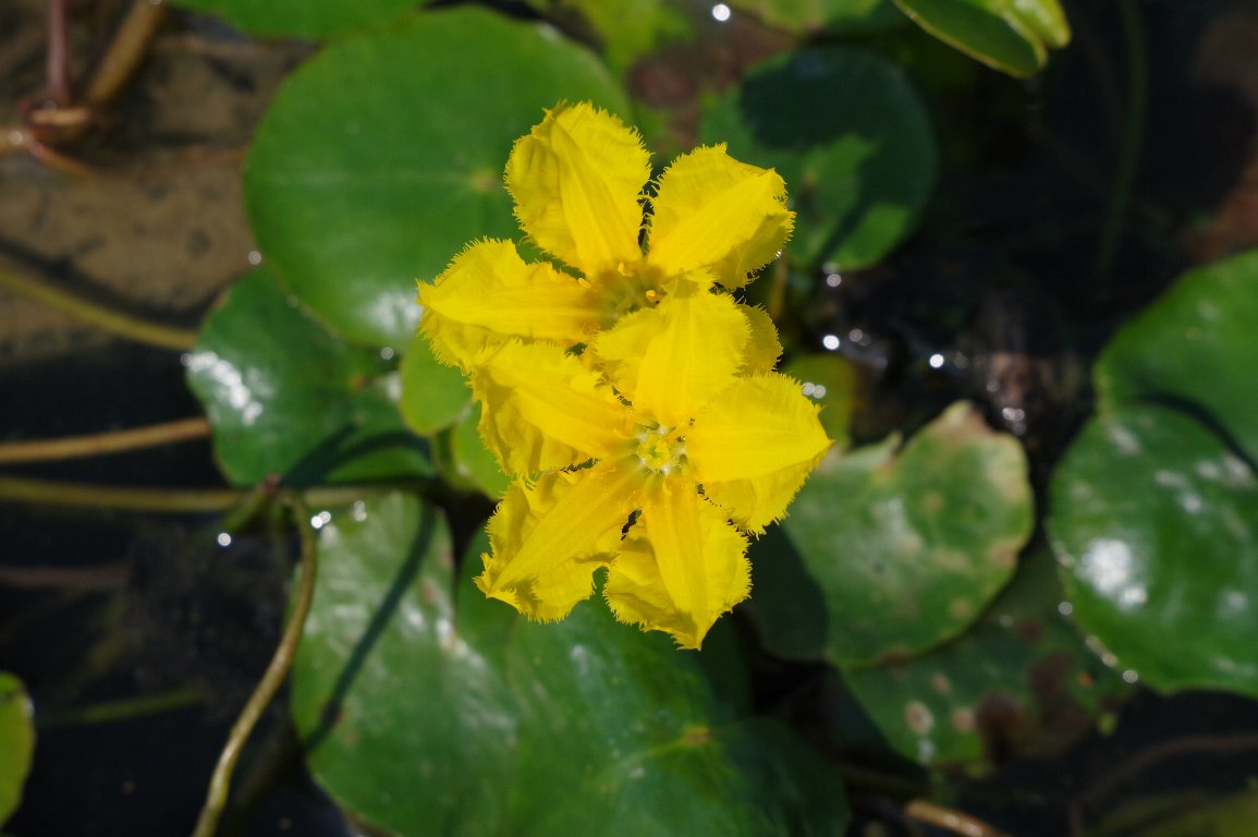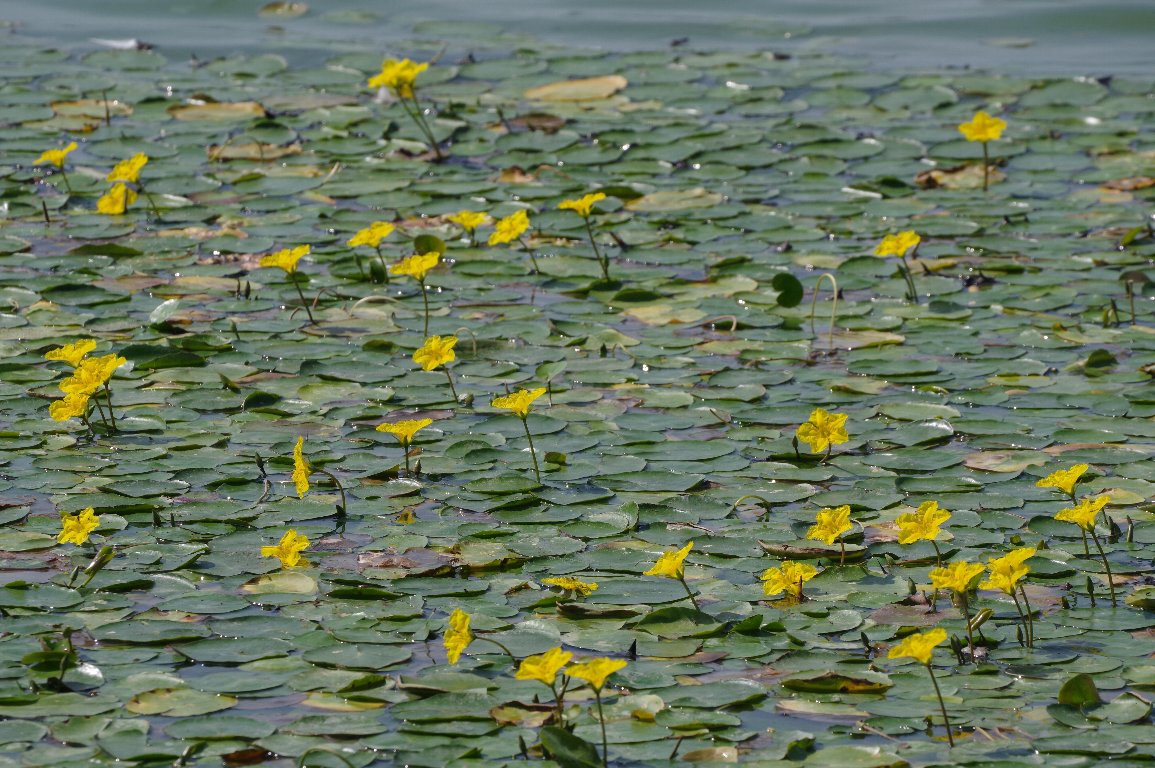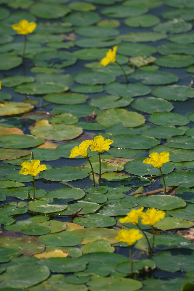 池に広がる丸い葉のアサザ。幾つもの黄色い花が空を見上げて咲いている。 こんなにたくさん咲いているのは、二十年近く通って、初めて見た。 保護活動が実を結んだのだろう。 |