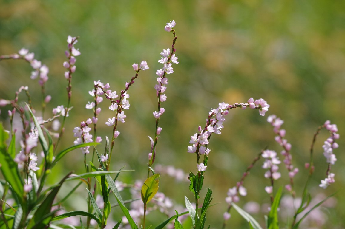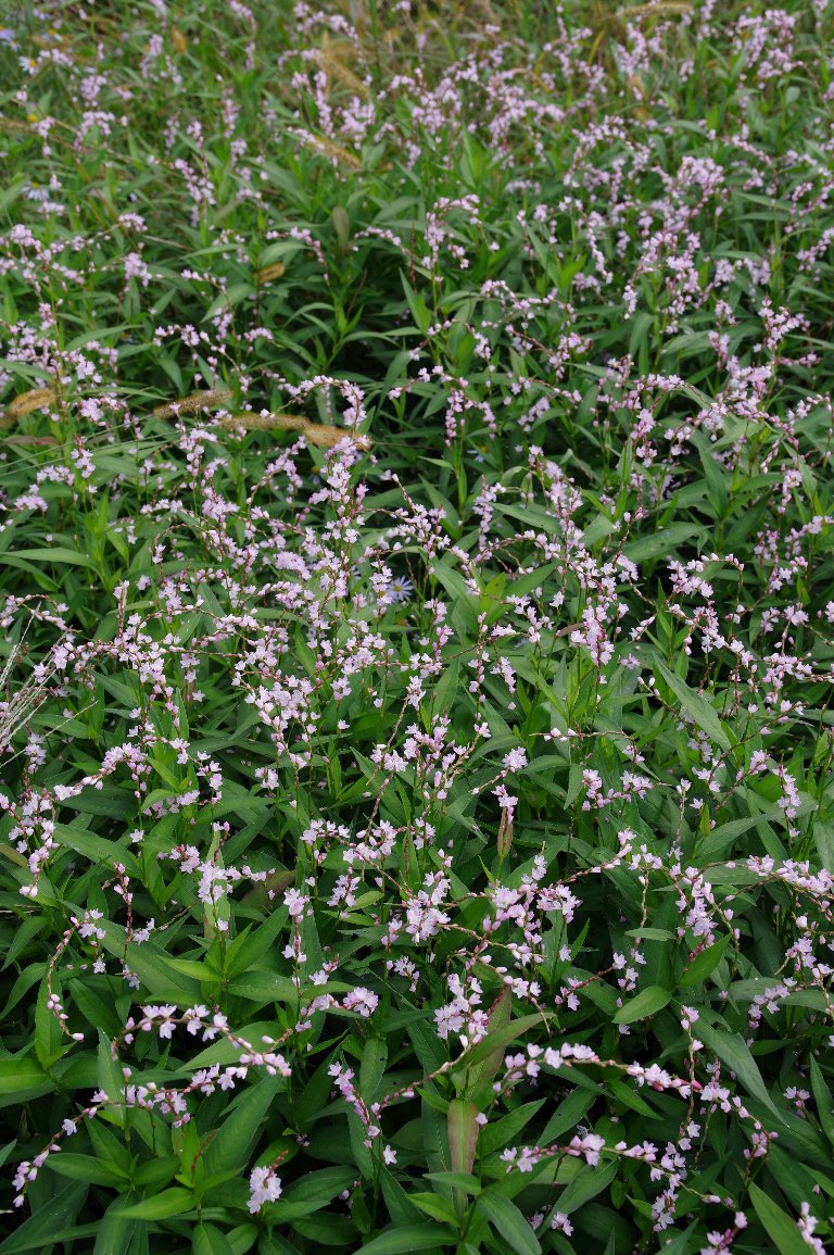 休耕田が、まるで、お花畑だった。いろんな花が咲いている。 とりわけ見事だったのがサクラタデ。田んぼいちめんが、薄桃色の花模様。 朝早く、湿った空気の中、しっとりとした景色が広がってた。 |