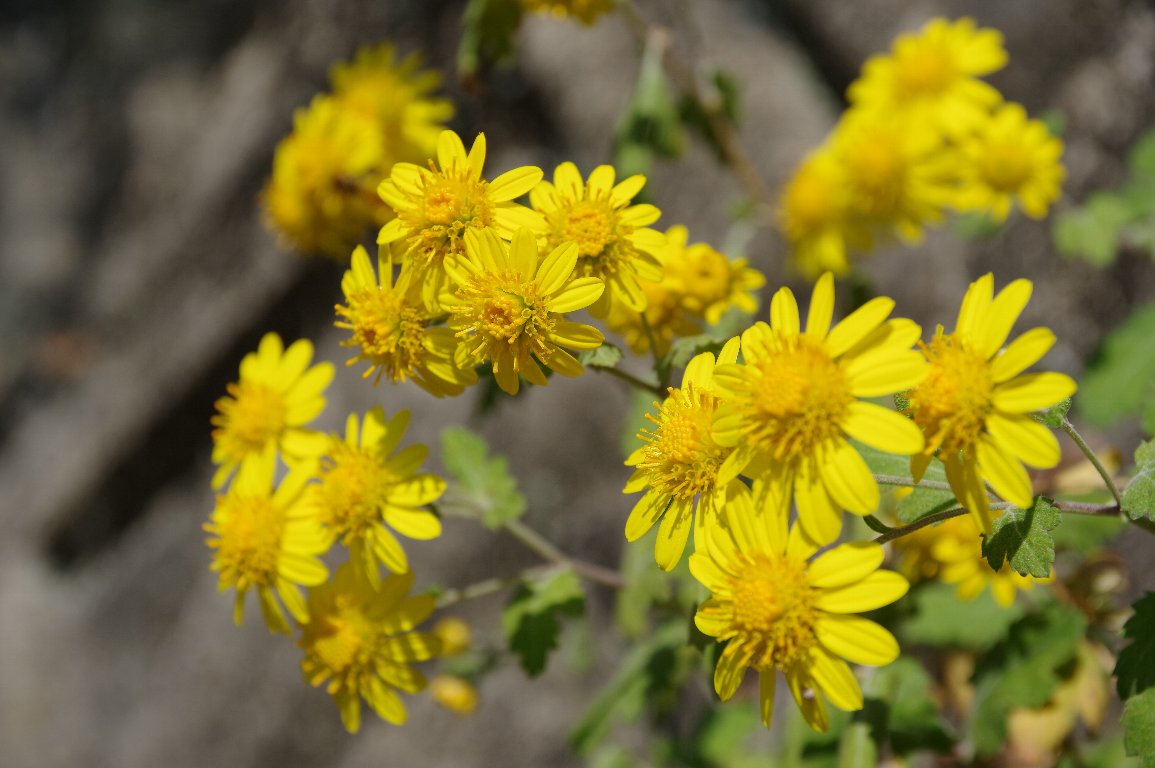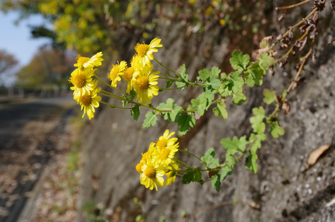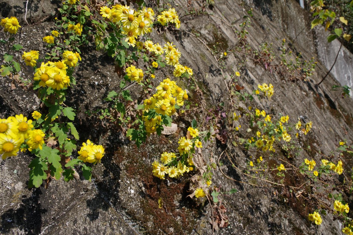 山道の、日当たりの良い古いコンクリートブロックの隙間から、たくさんの黄色いキクの花が