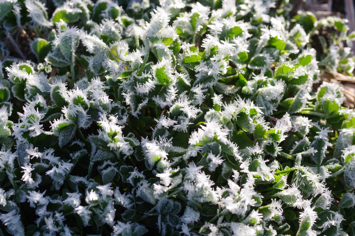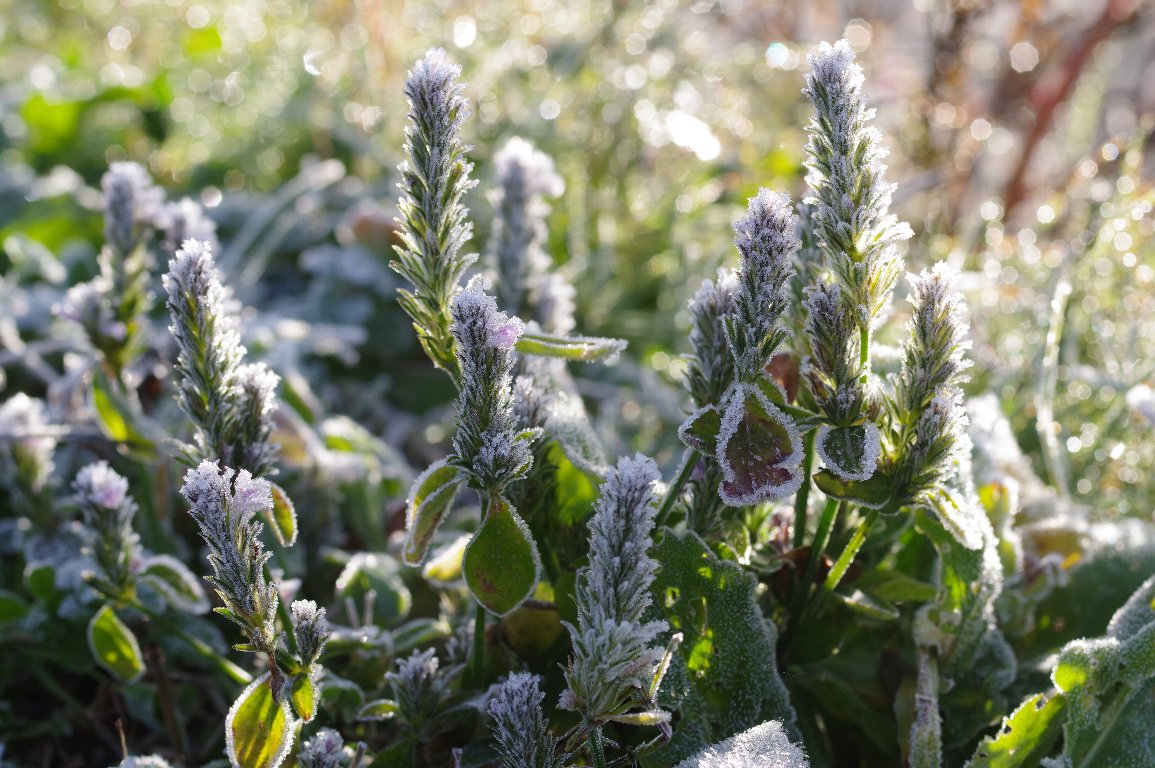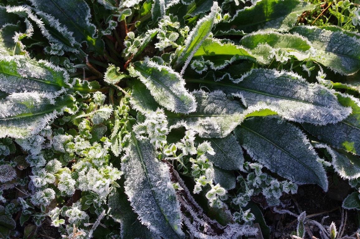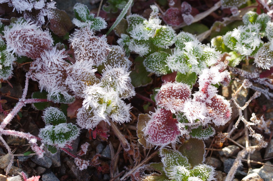 12月の頭、思いがけずよく冷え込んだ朝、田んぼのあぜ道は、きれいな霜で覆われていた。 真っ赤に色づいたヨモギの葉。縁取りのように霜が覆う。 日が当たった瞬間、輝きを増し、すぐに融けてゆく。つかの間の美しさだ。 |