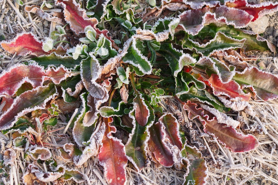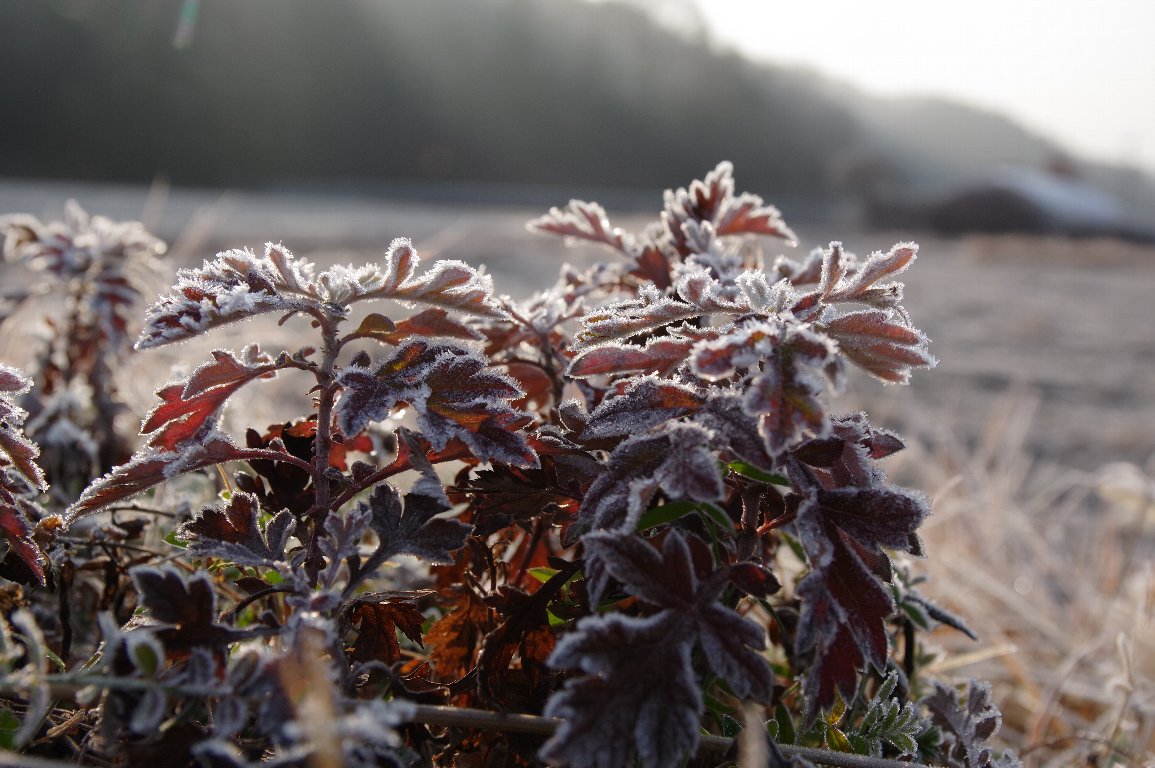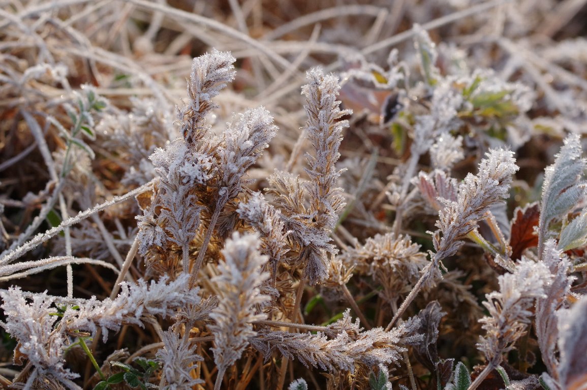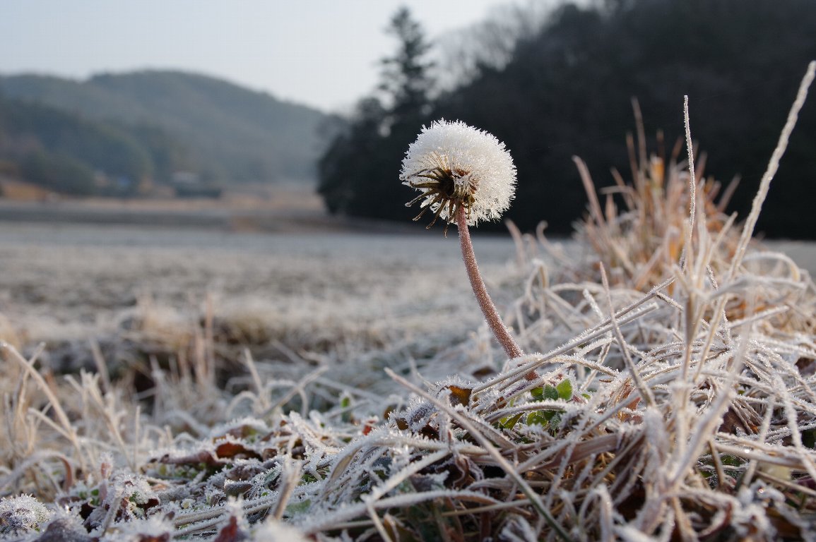 12月に霜景色を撮影したあぜ道に、再びやって来た。 今回もきれいな霜が降りているが、植物たちの様子が少し変わっている。 先月、花をつけていたセイヨウタンポポは、真っ白な綿毛になって霜をまとっていた。 |