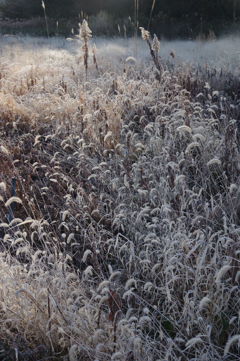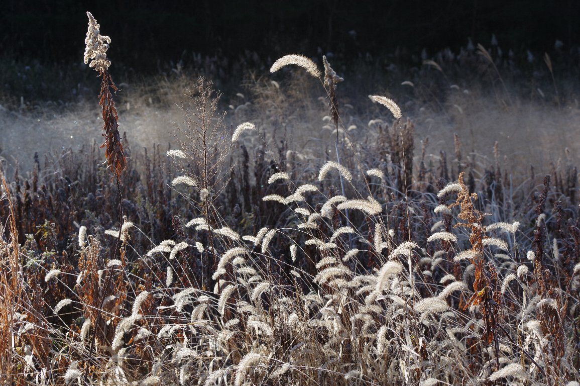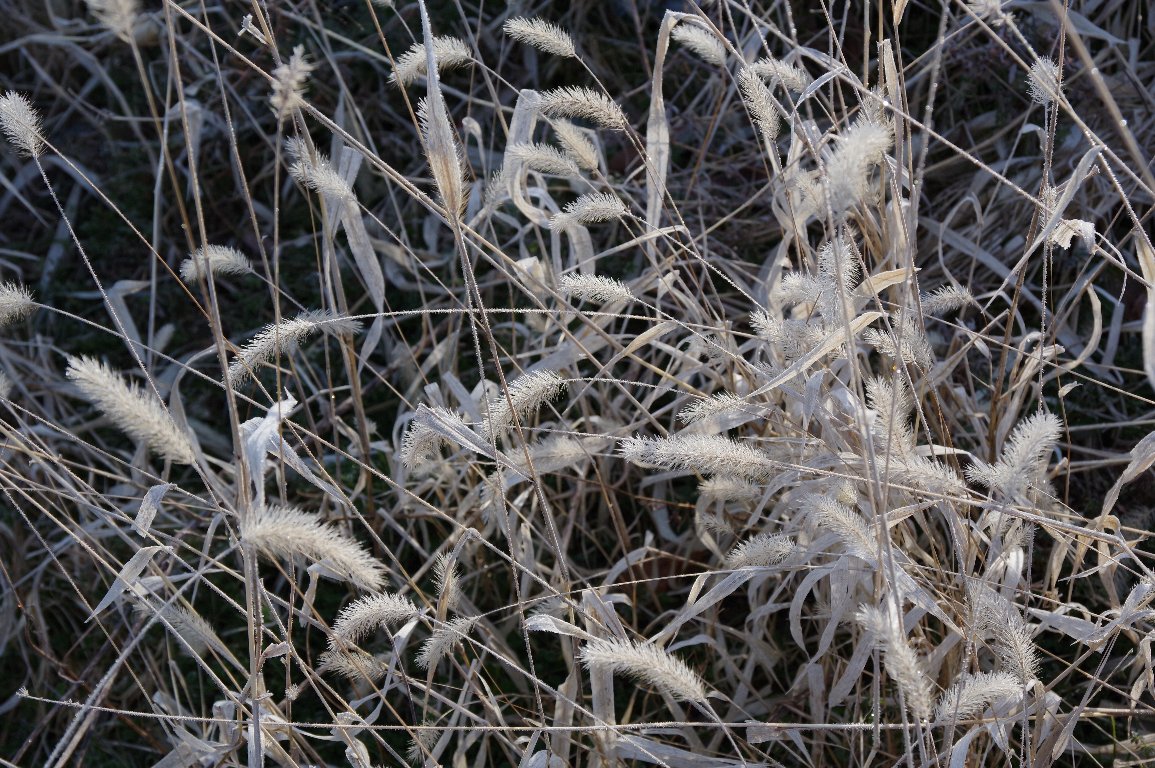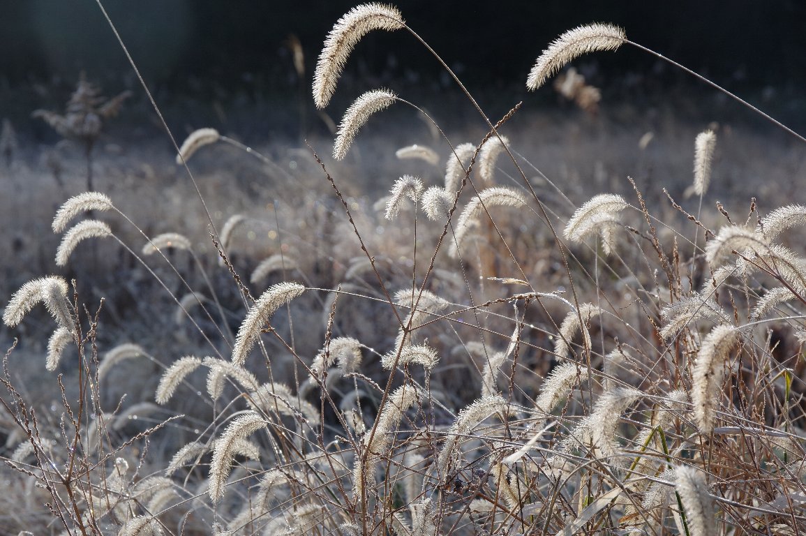 1月の寒い朝、休耕田に日が射し始める。 自由奔放に伸びたアキノエノコログサに、びっしりと降りた霜。 ゆっくりと融けながら、いっときの、光のシンフォニー(交響曲)を奏でていた。 |