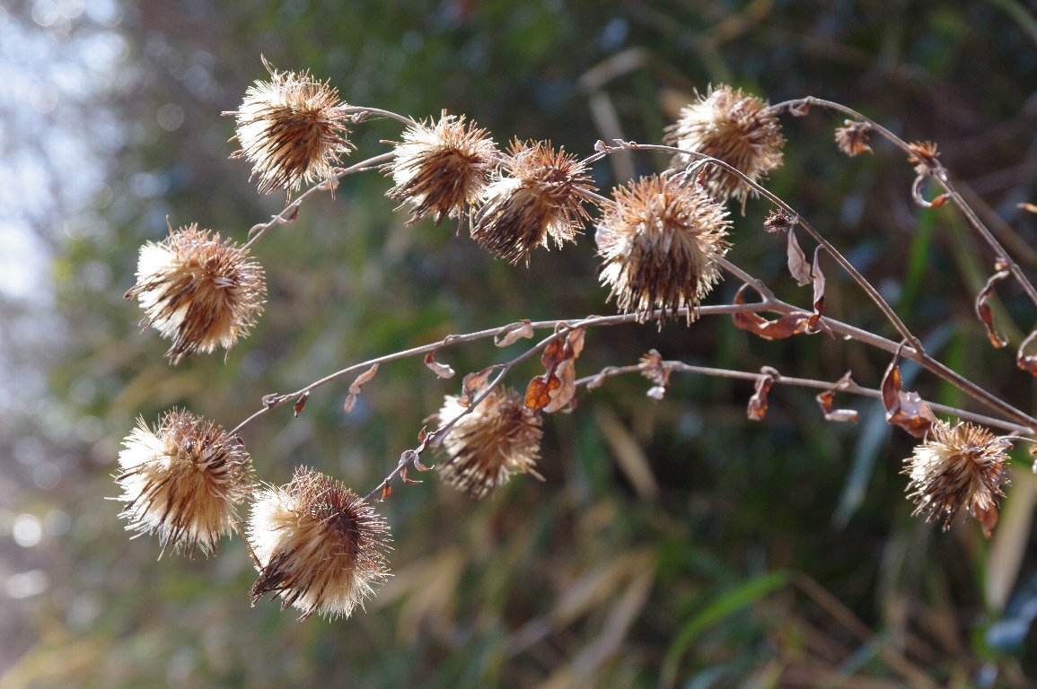 撮影雑記: ほとんど花がない冬の季節ですが、霜が降りた姿や、陽射しを受けた枯れ草など、探せば、おもしろい被写体が見つかります。 ![]() 道ばたの土手に、ヤマノイモの仲間の実が枯れ残って、草に絡まっていました。 日が当たって、光に透かされ、なかなかおもしろい姿です。 実のさやの様子から、オニドコロと思われます。 ![]() こちらは、別の場所で見つけた、やはり、ヤマノイモの仲間の枯れ草。 ヤマノイモでないのはまちがいないと思いますが、さやの写真だけでは、種類までは特定できませんでした。 オニドコロ、キクバドコロ、カエデドコロのどれかとは思うのですが。 ![]() こちらは、オニドコロを見つけた近くにあった、キクバヤマボクチの花の枯れ姿です。 アザミに似た花ですが、硬い繊維質の草なので、冬場、枯れ残っている姿をよく見ます。 |