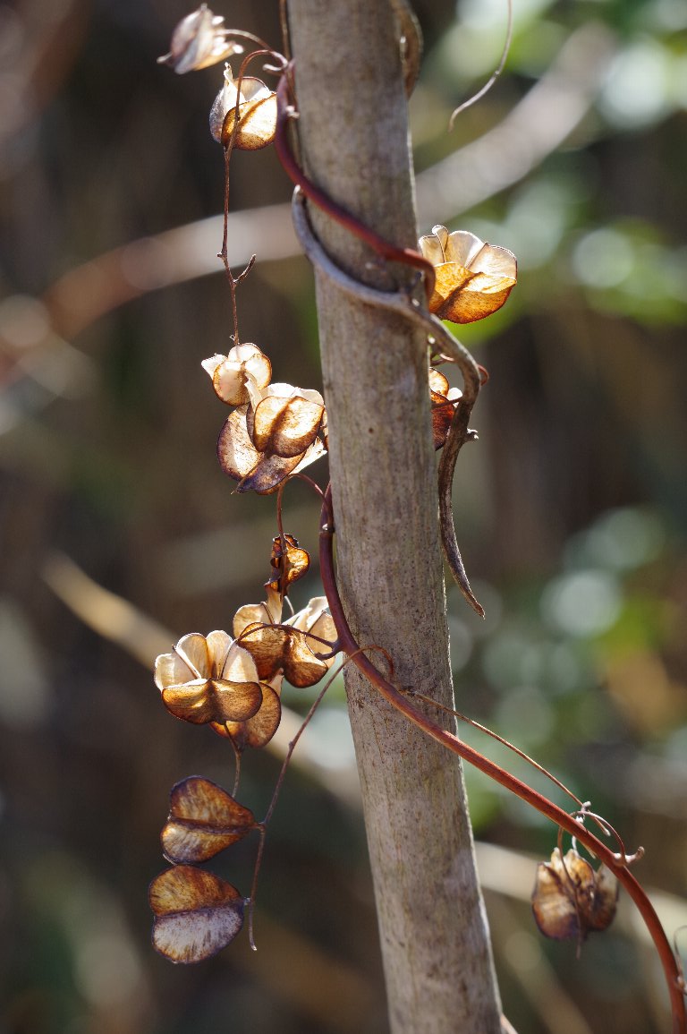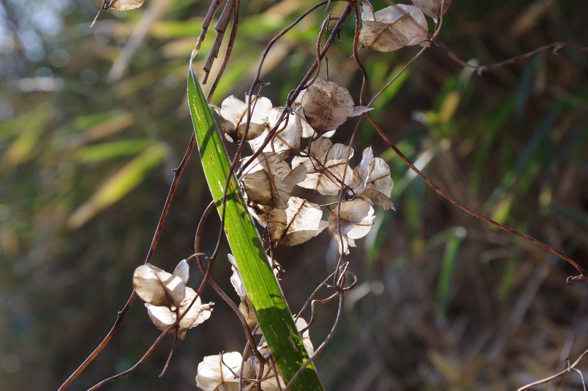 冬場は、いろんな草花がドライフラワーになっている。 花、実、葉など、きれいに枯れ残っている姿は、けっこうおもしろい。 草に絡まっていたオニドコロの実のさやも、ユニークな姿を見せていた。 |