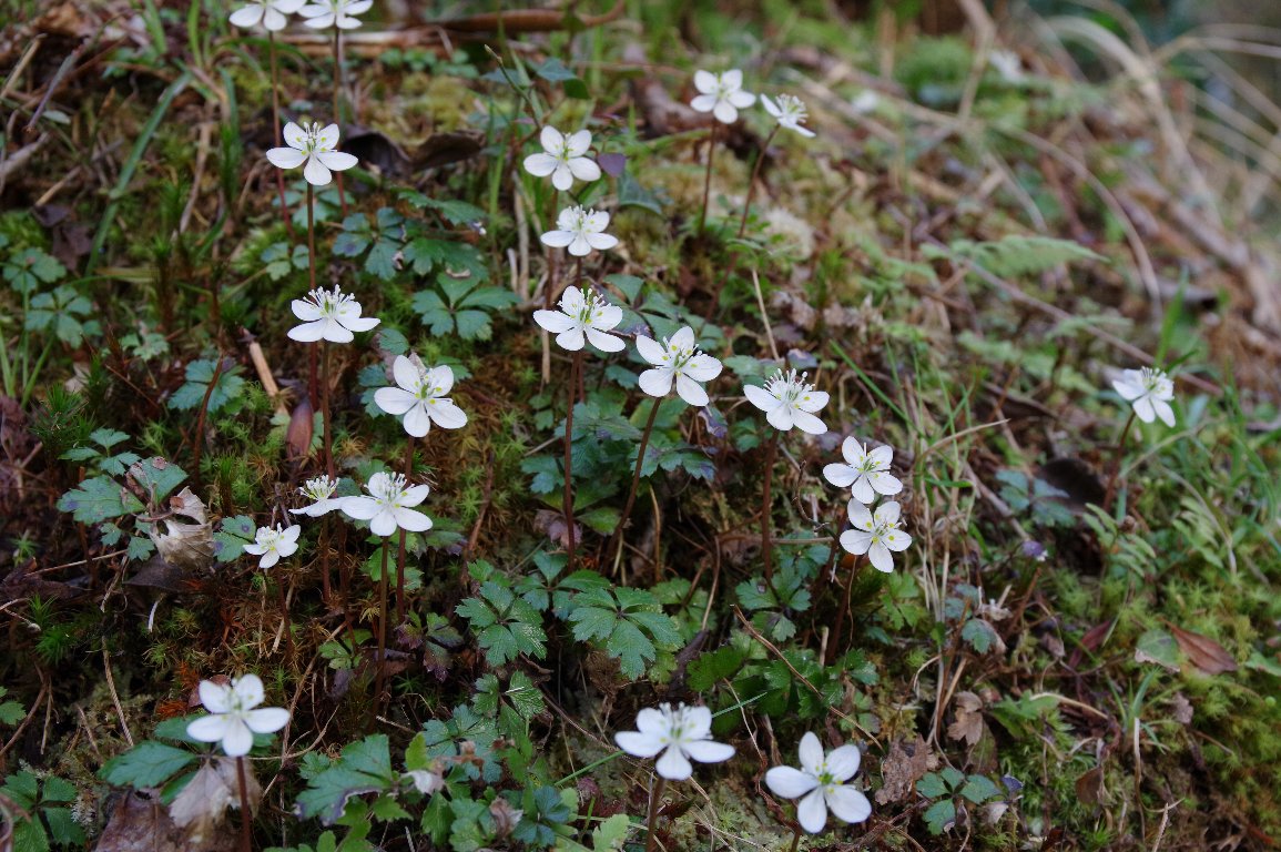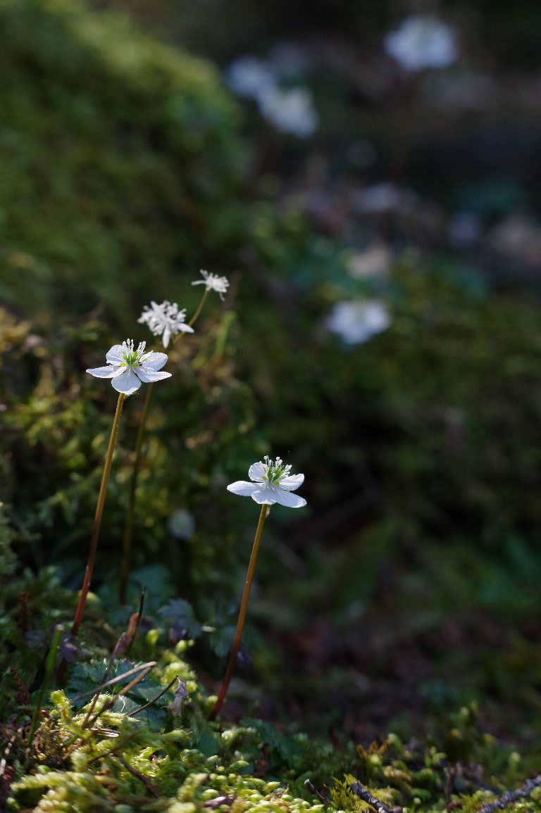 撮影雑記: 朝ドラ「らんまん」で、すっかり、お馴染みの花となった(と思っていますが、どうなんでしょう?)、 バイカオウレン。 関西あたりでも、山のところどころに自生します。 寺社の森などにも自生しているところがあり、そんな場所に訪れました。 ![]() ちょっとした群落もあります。 オウレンの仲間で、5弁の花びらがウメの花を連想するところから、梅花黄連の名が付きました。 ![]() 苔むした小径に、点々と咲いています。 木漏れ日が花に当たった時が、シャッターチャンス。花が飛ばないように、露出に気をつけて。 ![]() 陽が当たるときれいですが、光の捉え方はなかなか難しい。 逆光気味の一枚です。 |