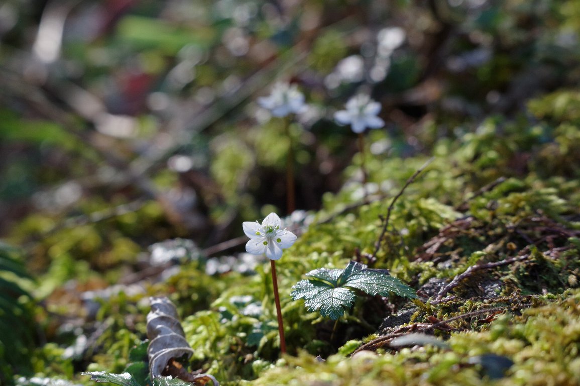 お寺の裏山の小径を歩くと、苔むした倒木や地面のところどころで、小さな白い花が、