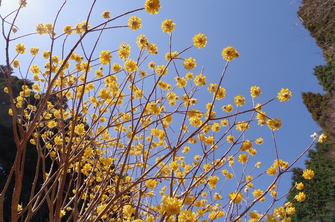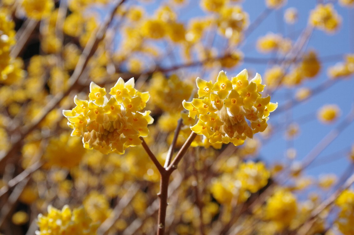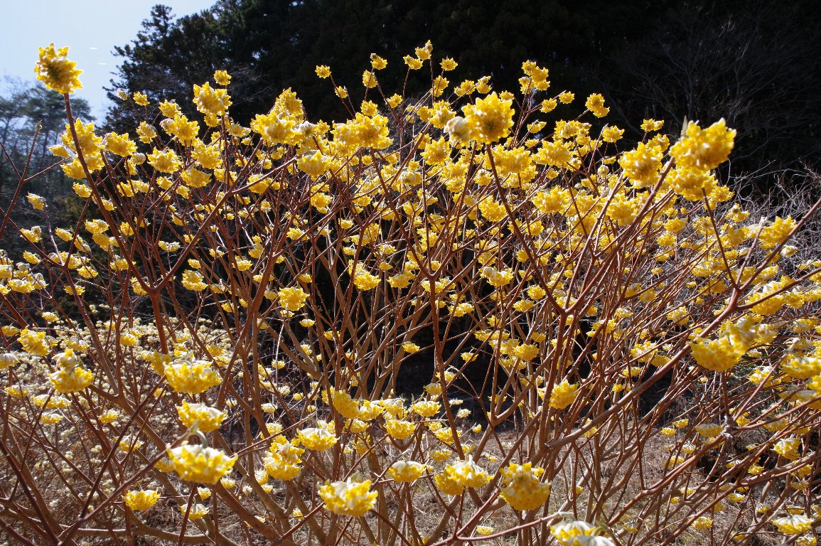 和紙の原料になるミツマタは、春浅い3月に、鮮やかな黄色い花を咲かせる。 葉が展開する前、枝に球形の花が高密度で付いて、しかも、群生することが多く、 谷全体が、黄色く染まって見える。 |