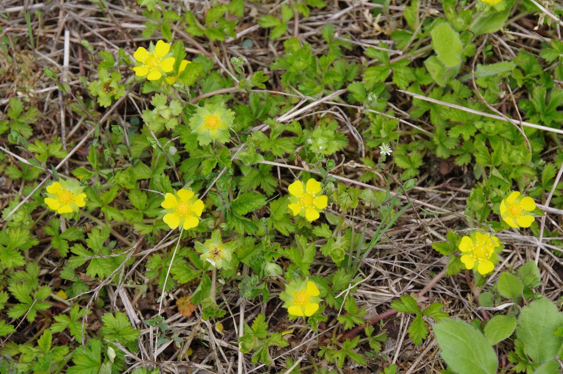 地面を這うように広がって、黄色い5弁の花が点々と咲いている。 似たような種類がいろいろあるが、これは、ヘビイチゴだ。 1か月も経ったら、赤い実が、点々と生っていることだろう。 |