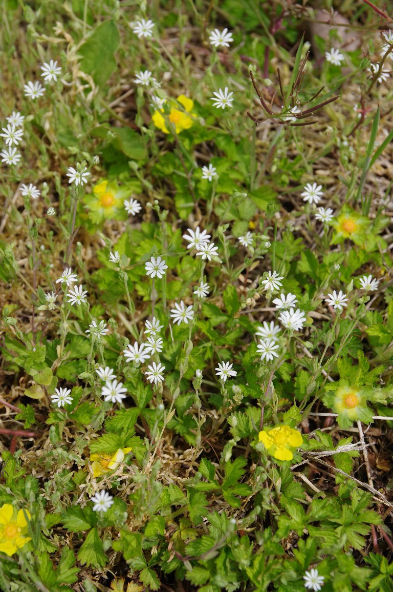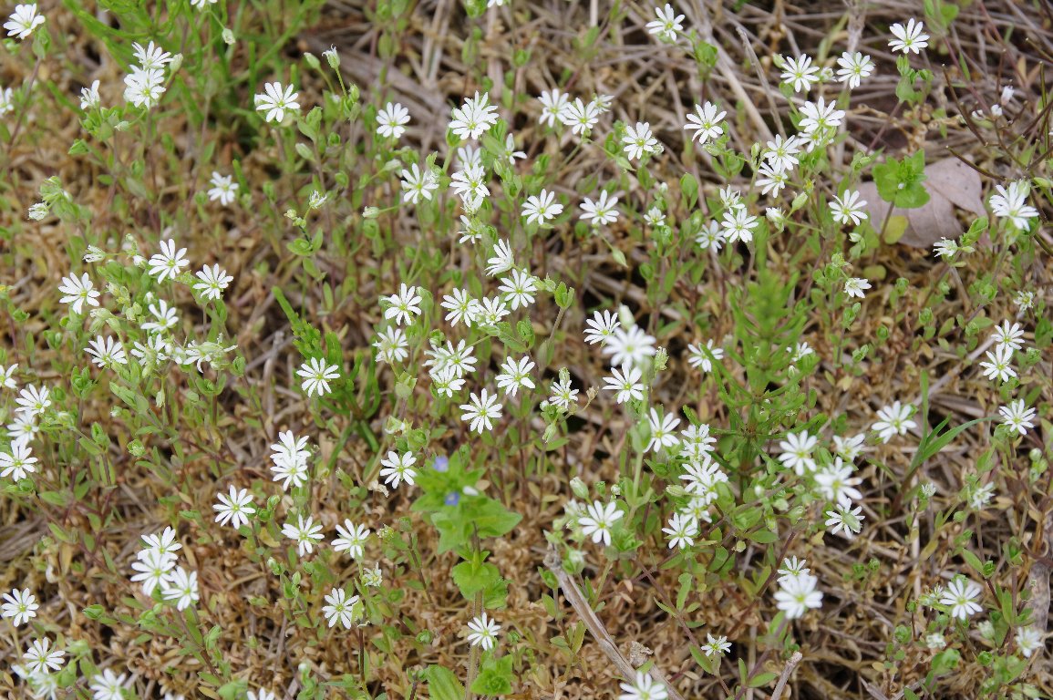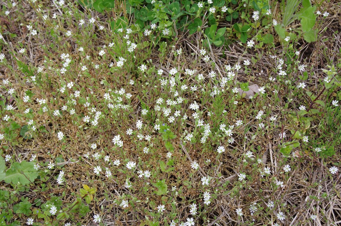 休耕田に、細かい白い花が、ばらまかれたように咲いている。 ハコベに似てるが、華奢な感じ。そう、ノミノフスマだ。 今まで見た中で、いちばんにぎやかに咲いていた。 |