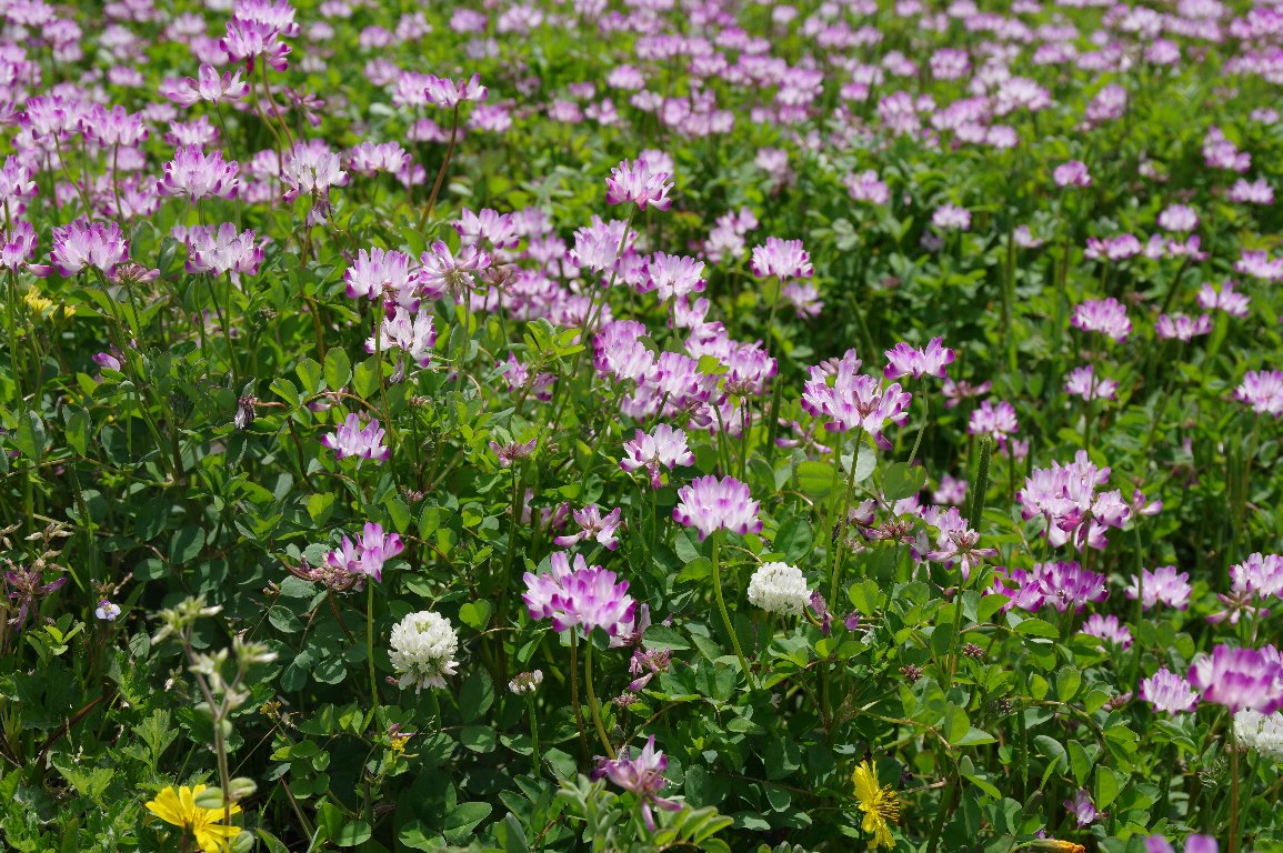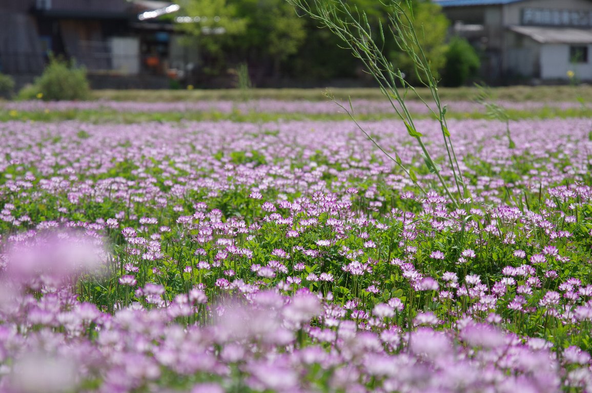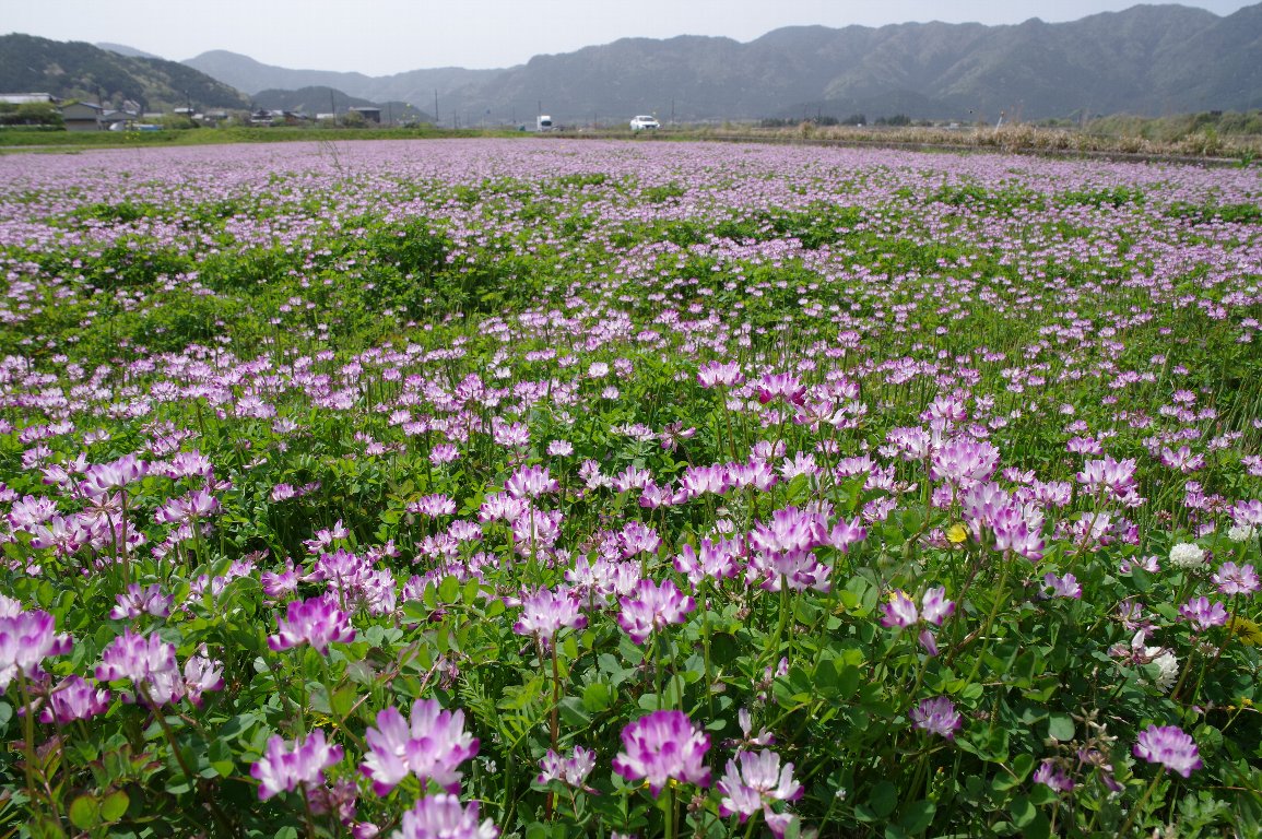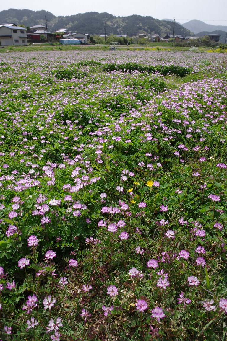 丹後からの帰り道、高速を走る車窓から一瞬見えた、れんげ畑。 まだ4月の半ばなのに? 翌日、あらためて訪れて見ると、いちめんに、レンゲソウが咲き誇っていた。 |
