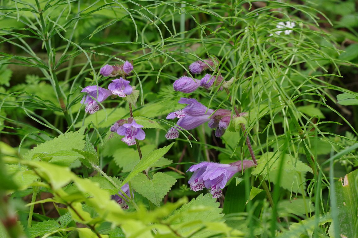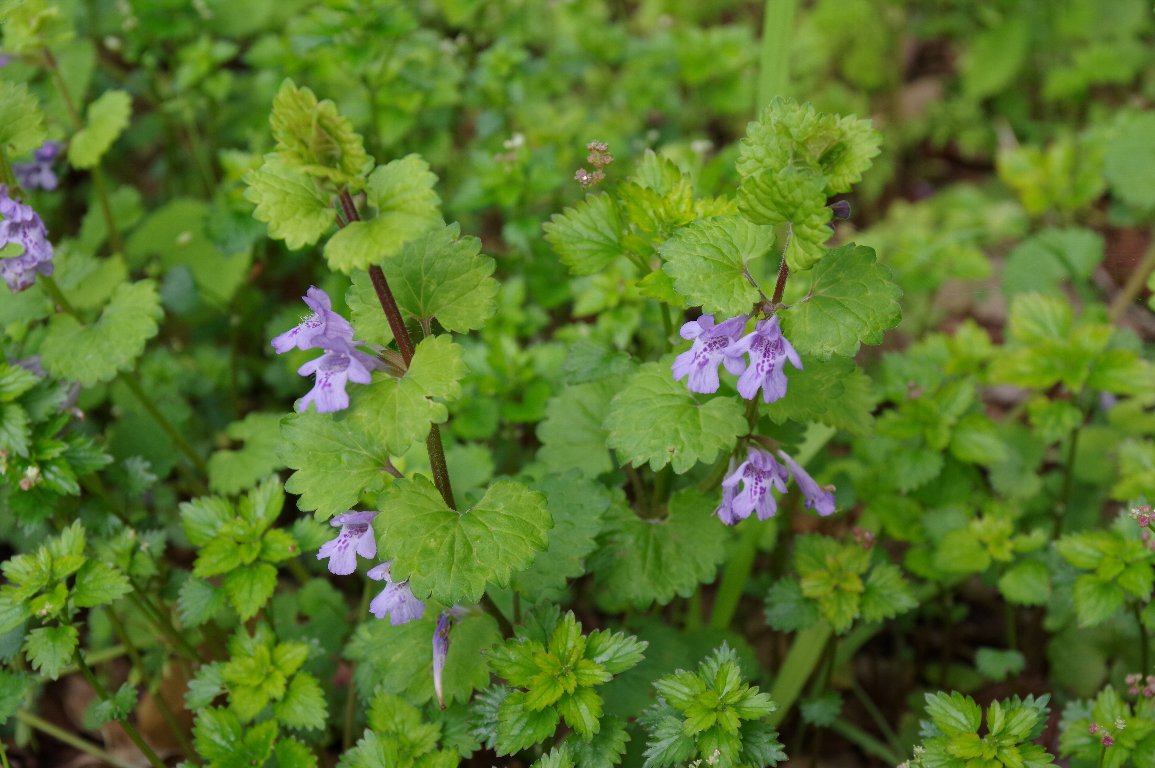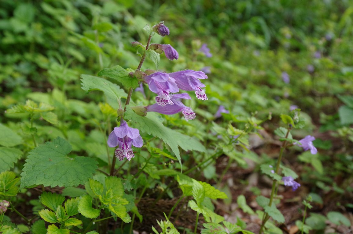土手の草むらに、紫色のやや大き目な花が咲いている。 ラショウモンカズラの花だ。 春の淡い色合いの草の中にあって、ひときわ、存在感を放っていた。 |