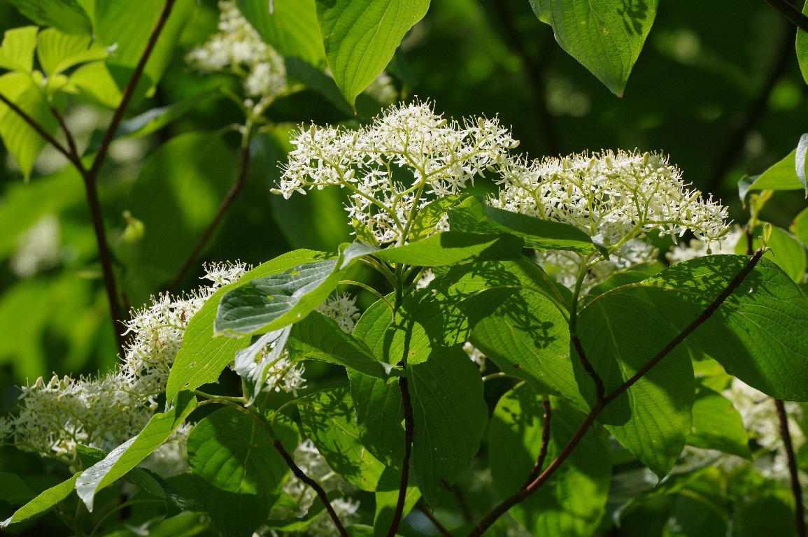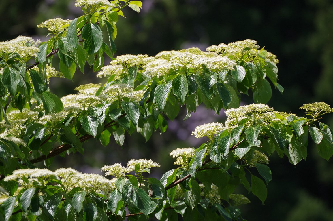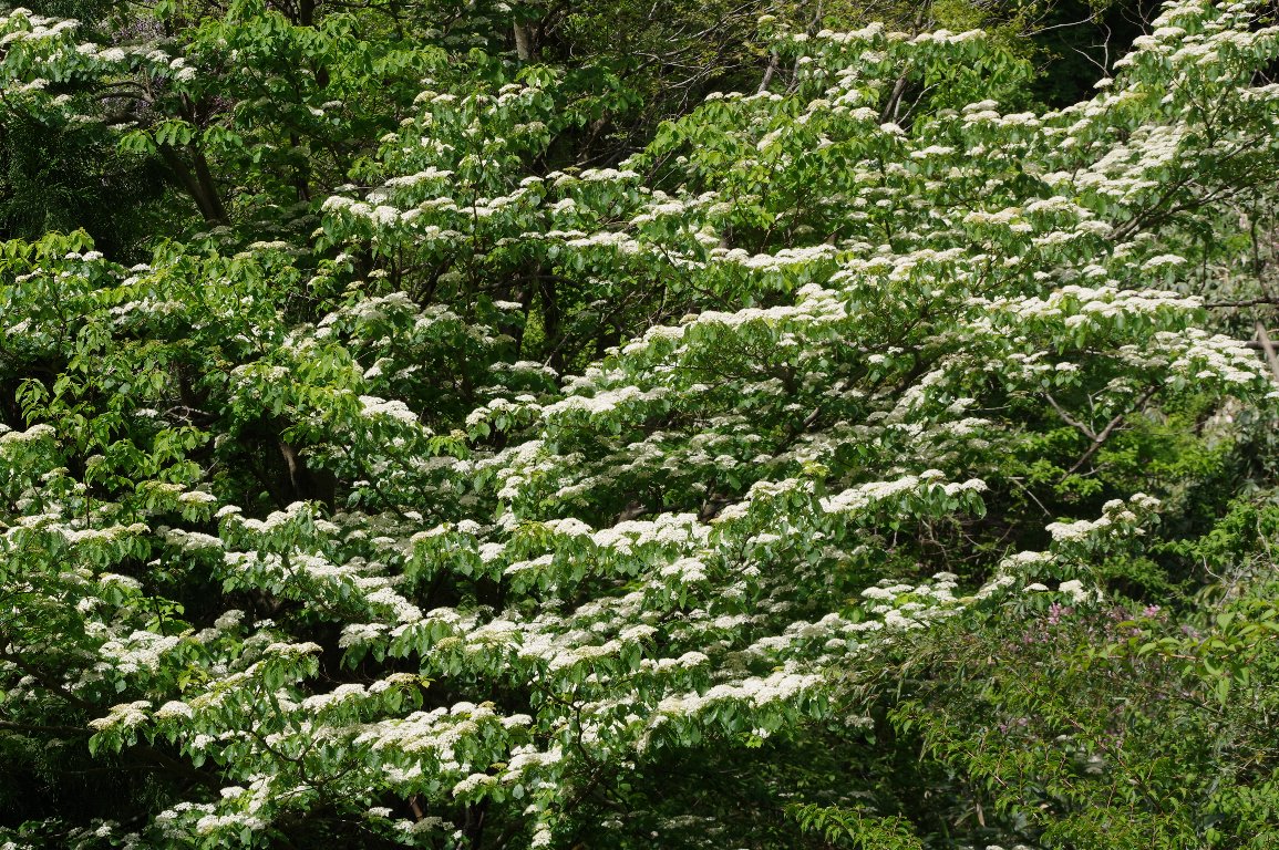 撮影雑記: 初夏は、山々で、ミズキの大木が、淡いクリーム色の花を咲かせるころです。 しかし、それにしても、ミズキの花の多いこと! こんなに、あちこちで咲いているミズキの花に会ったのは、初めてです。 地味なミズキの花も、これだけ咲いていれば、いやでも目立ちます。 ![]() 枝の上側に、丸く広がった細かい花を、列になってたくさん咲かせます。 ![]() 下から仰ぎ見るミズキの花。 ![]() 広げた枝という枝に、見事に咲き揃っています。 ![]() ミズキは、こんな大木になります。 水木の名は、春先に枝を切ると、水がしたたり落ちるから、だそうです。 試したことはありませんが、本当なんでしょうかね。 |