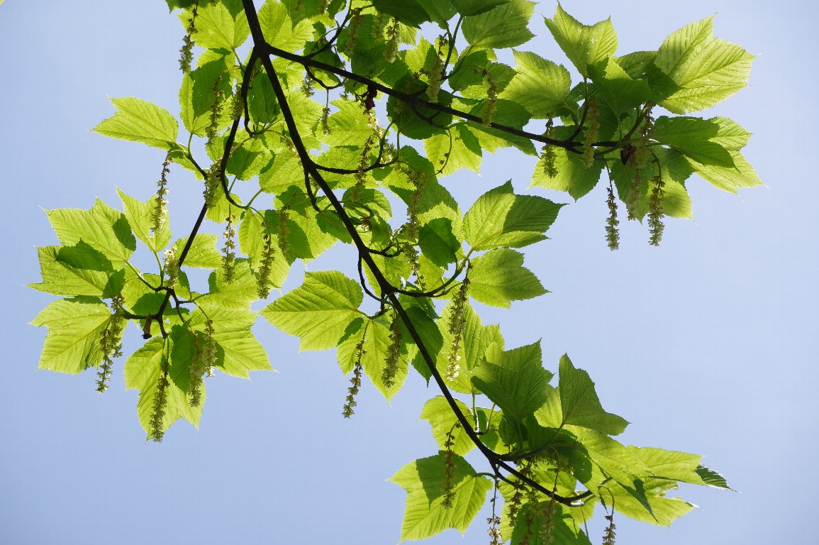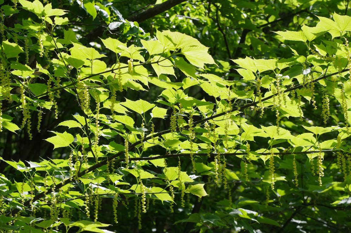 秋に橙色に染まるウリハダカエデも、新緑の季節には、青々とした若葉を広げている。 枝先を見ると、小さな緑色の花を、ぶら下げるように咲かせていた。 |