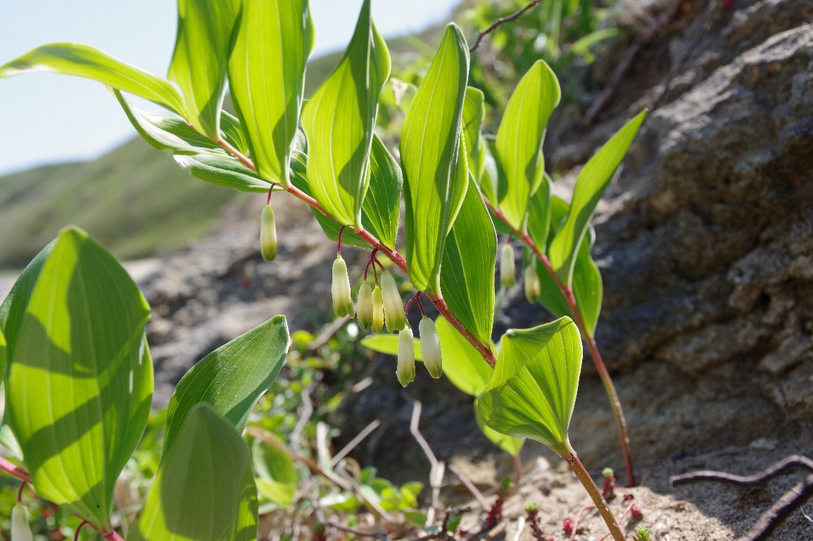撮影雑記: かつてのユリ科は大きなグループで、単子葉で、かつ、3の倍数の花の構造を持つ多くの種類を含んでいました。 近年、DNA解析に基づく新しい分類体系(APG)によって植物の分類も大きく変わりました。 ユリ科についても、多系統の様々な種類の寄せ集めであることがわかり、大きく解体されました。 ナルコユリも、かつてはユリ科でした。 でも、今は、キジカクシ科(クサスギカズラ科)であるばかりか、科の上位の分類ですら、ユリ目からキジカクシ目に 変わりました。 葉っぱの質感などはユリそっくりだし、ユリ科と言われても違和感なかったのですが、全然ちがう仲間だったんですね。 ![]() 山で見ることも多いですが、海岸でもよく見かけます。 ![]() 花のアップ。 よく似た花にナルコユリがありますが、そっくりです。 アマドコロの名の由来は、甘味のある根から来ています。 では、アマドコロの根を食べることがあるのか調べたところ、きんぴらにするレシピが見つかりました。でも、あまり、 一般的ではないようです。 |