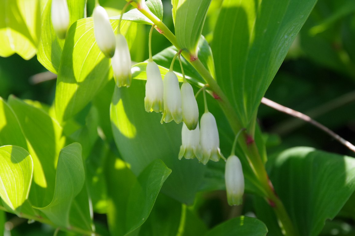 ユリに似た葉を広げるが、ユリとはちがう、小さな筒状の白い花が並んでいるアマドコロ。 大きなユリの花も美しいが、小さな鈴をぶら下げたような花もかわいい。 |