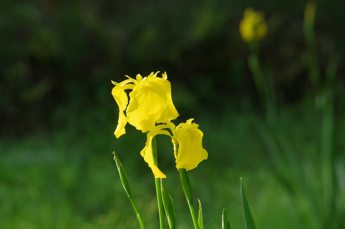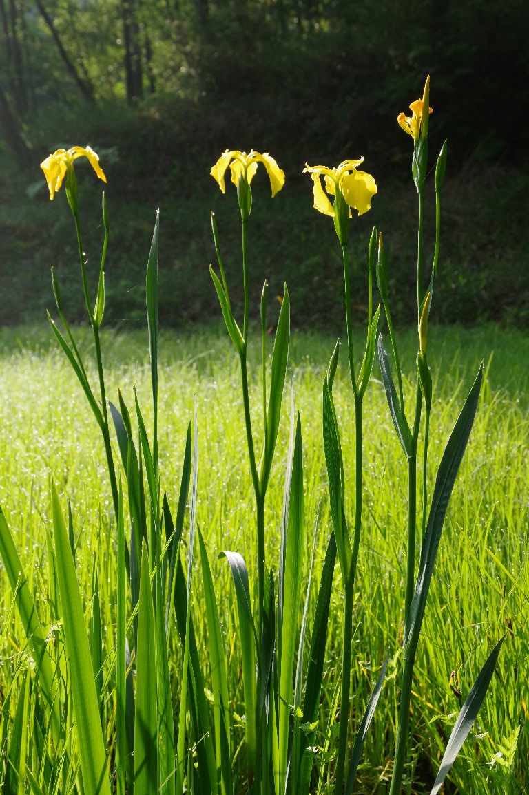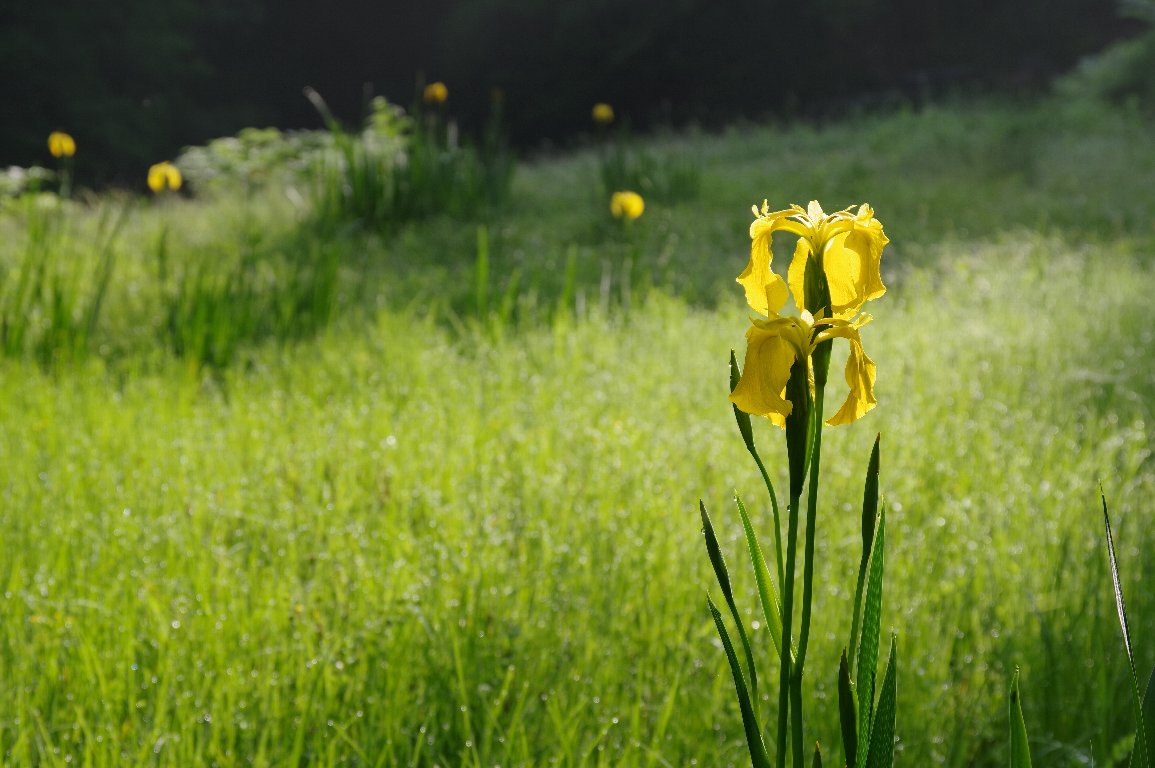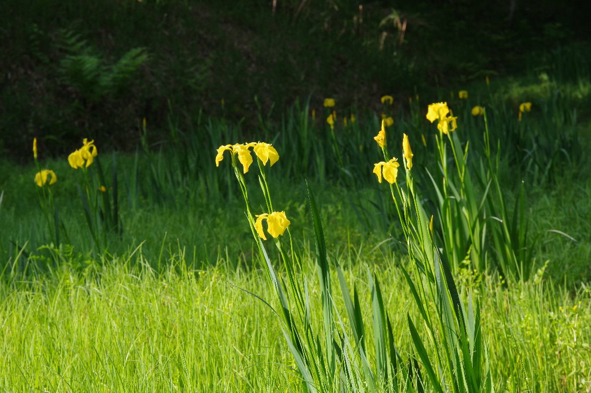 今は湿地のようになっている休耕田。 そこに、鮮やかな黄色い花が点々と咲いていた。キショウブの花だ。 帰化植物だが、あちこちの田んぼの脇や、ちょっとした湿地で、すっかり、景色に馴染んでいる。 |