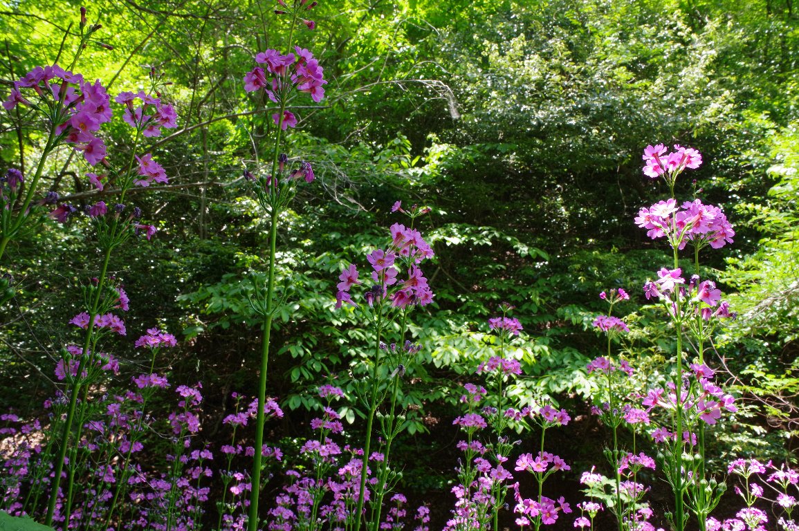 近くの山のクリンソウの自生地に、やっと、訪れた。 強い日差しの中、くぼ地に、花壇のように密集して咲いていた。 満足して帰ったのだが、ここは、自生地の中心ではなかった。もっと広範囲に咲いているらしい。 |