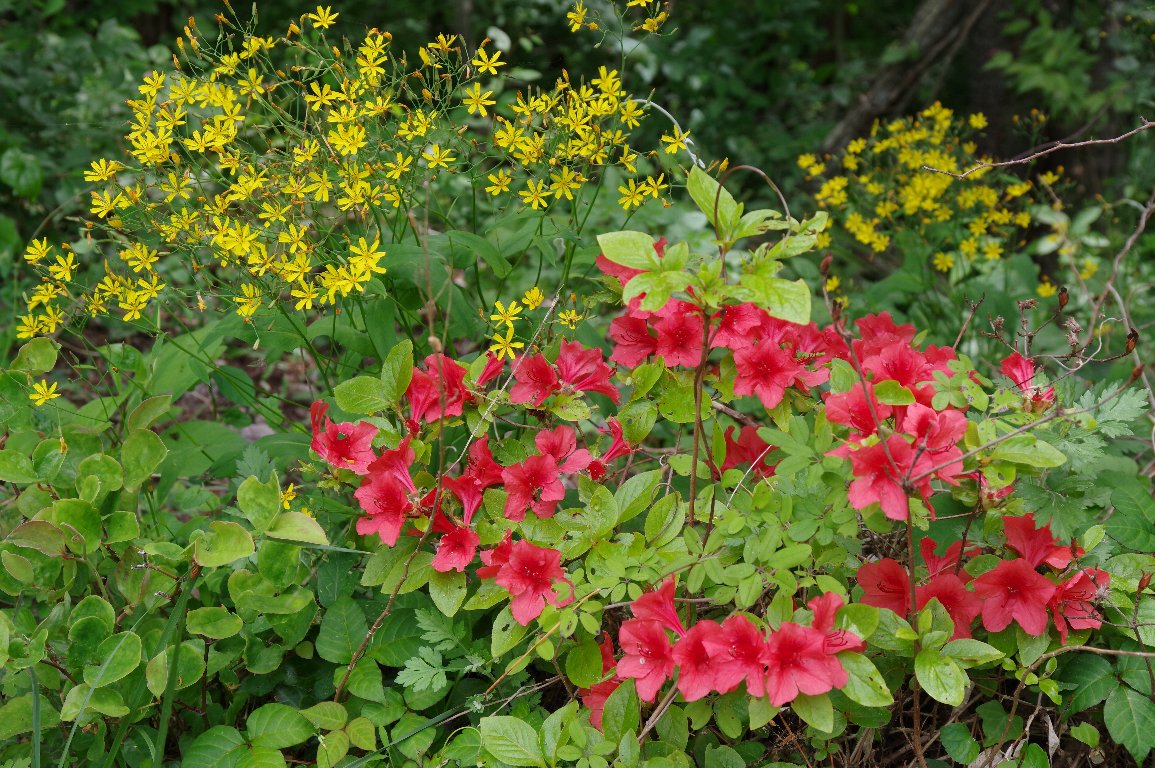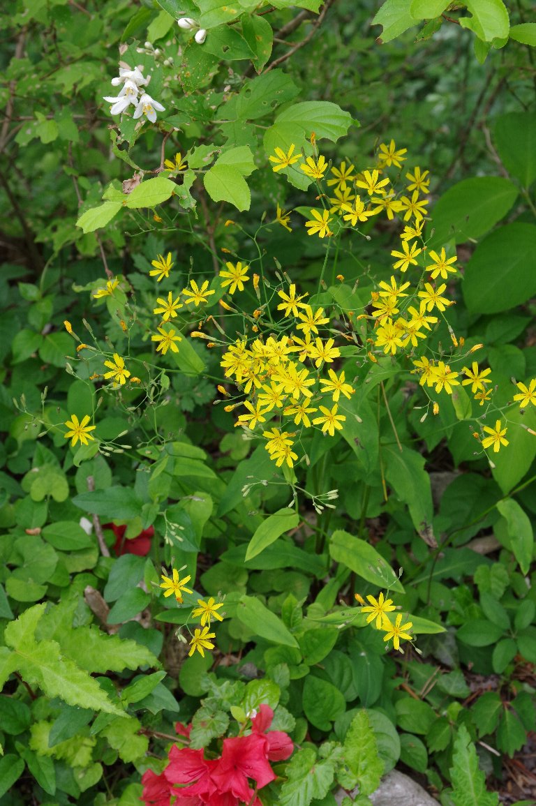 撮影雑記: ニガナは、春の中盤から終盤に咲く花です。 この花が咲き始めると、春も後半だなあと思います。 5月の終わりに三瓶山を訪れた時も、あちこちで、ニガナの花を見ました。 ![]() 山の尾根道沿いに、たくさん咲いていました。 少し乾いたところを好むようです。 ![]() こちらは、トップに載せた、道ばたのニガナ。 上の写真でちらっと写っていたヤマツツジは、実は、こんなに広がって咲いていました。 ちょっと珍しい、ニガナとヤマツツジの、黄と赤のツーショットです。 ![]() こちらは、ウツギ、ニガナ、ヤマツツジの、白、黄、赤のスリーショット。 ちょっと、強引ですが。 |