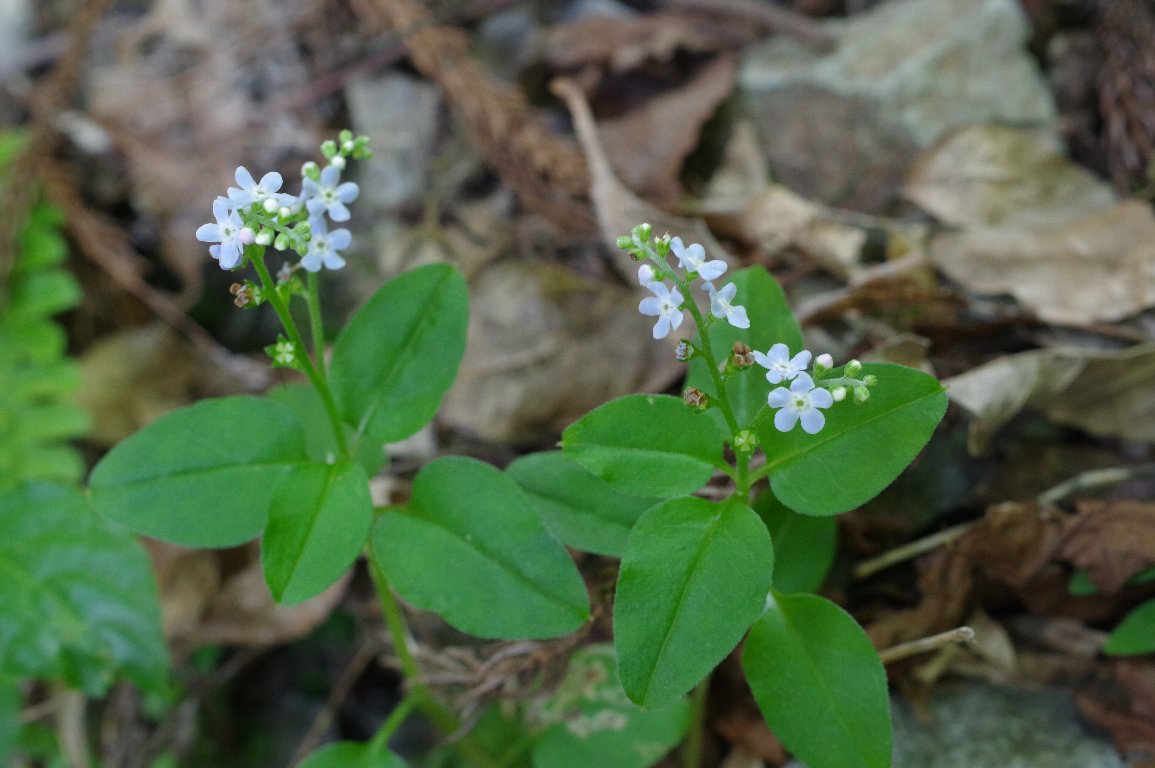 渓流沿いに、小さな水色の花が咲いていた。ミズタビラコの花だ。 道ばたに咲くキュウリグサに近い仲間だが、こちらの方が爽やかに思うのは、贔屓目だろうか。 |