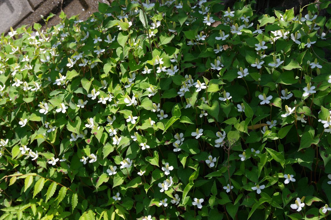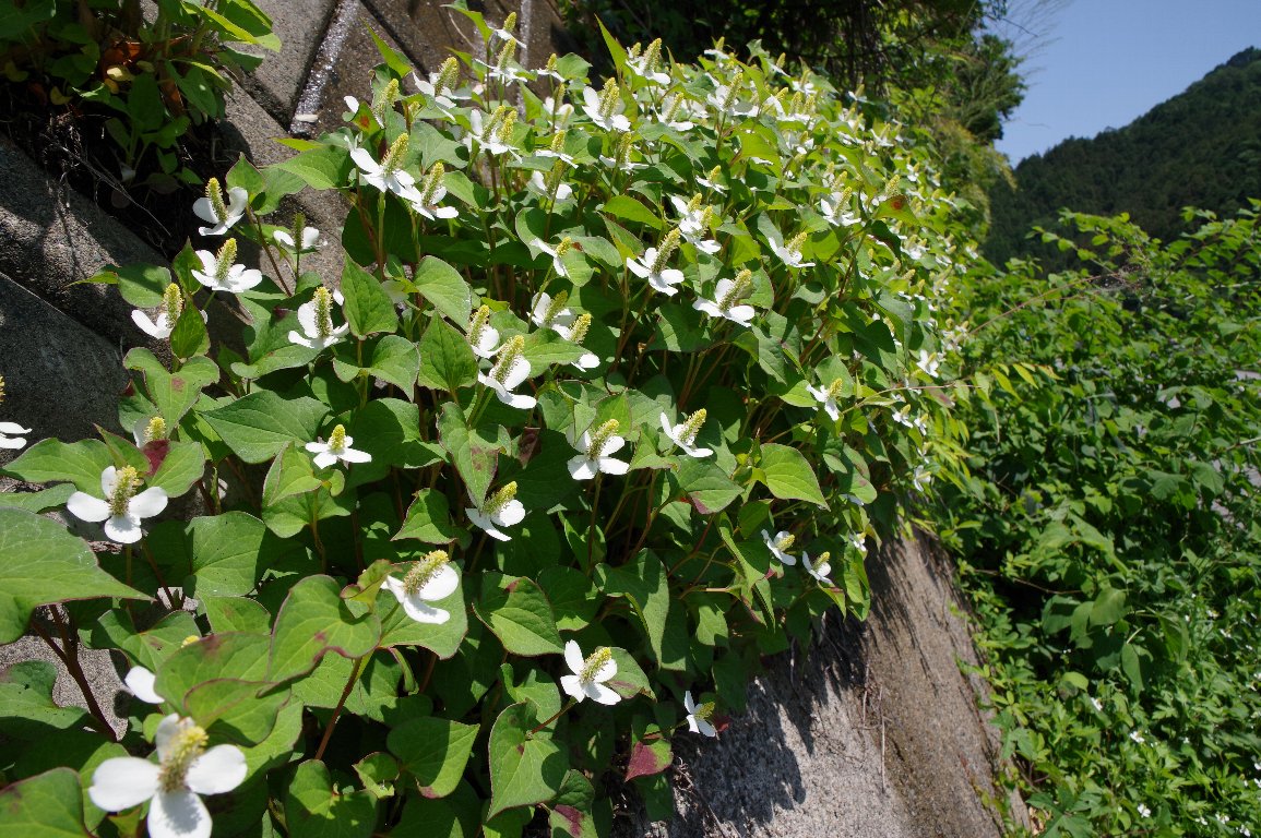 車で山から里に降りてくる途中、びっくりするようなドクダミの大群生に出会った。 コンクリートブロックの隙間に根を下ろし、びっしりと咲いている。 こんな日当たりのいい場所に咲いていると、ドクダミじゃないみたい。 |