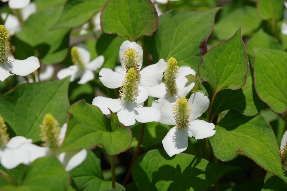 撮影雑記: この日は、花散策しながらのドライブ。 山の道端で、ミズタビラコ(今節気に掲載)や、ツルアジサイとコガクウツギ(両種とも昨年の芒種に掲載)を 撮影できて、気分もよく里に下りてくると、おおお?ドクダミが凄い勢いで咲いている! ドクダミだし、まあ、いいかと、いったんは通り過ぎたものの、どうにも気になって、引き返しました。 車を止めて、近づくと、なんとまあ、あきれるほどの大群落です。 ![]() 道ばたの、コンクリートブロックの脇の大群落。ブロックが隠れて見えません。 ![]() 初夏の日差しを燦燦と受けています。 ![]() アップで撮ると、とても、美しい白い花。 ドクダミとは思えません。 ![]() コンクリートブロックの中腹に、列をなして、こんもりと群落を作って咲いています。 こんなドクダミ、初めて見ました。 通り過ぎないで、引き返してよかったです。 |