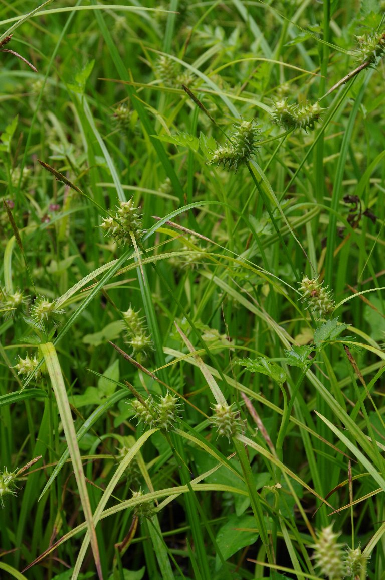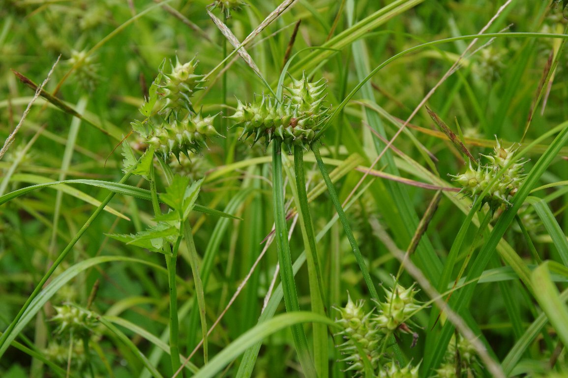 近所の散策コースの休耕田に、びっしり、草が生い茂っていた。 トゲトゲの実がたくさん付いてる。オニスゲという草の実のようだ。 地味だが、おもしろい形だ。 |