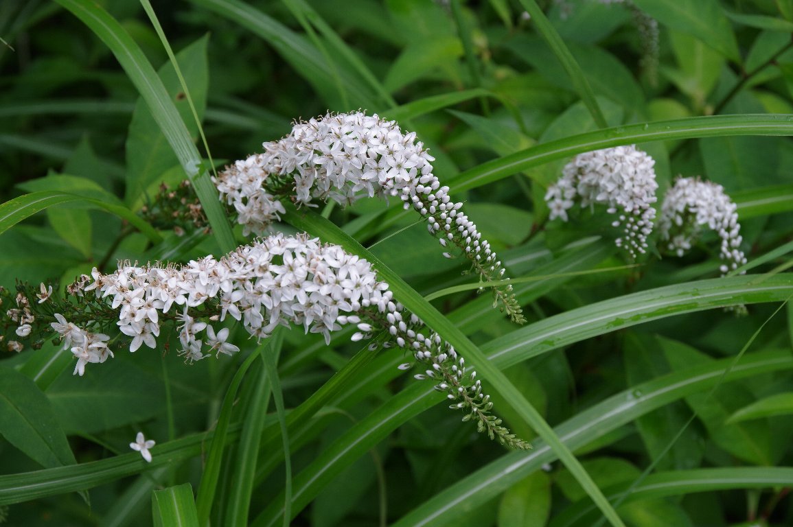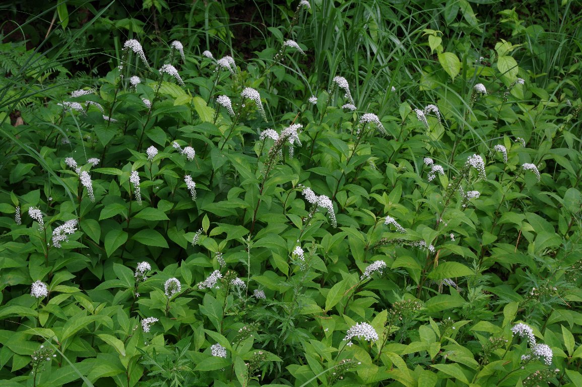 夏の初めごろ、茂る草に混じって、特徴的なカーブを描いて咲いている白い花を、時おり見かける。オカトラノオの花だ。 根もとから順々に咲いていく花は、ちょっと、ひょうきんだ。 |