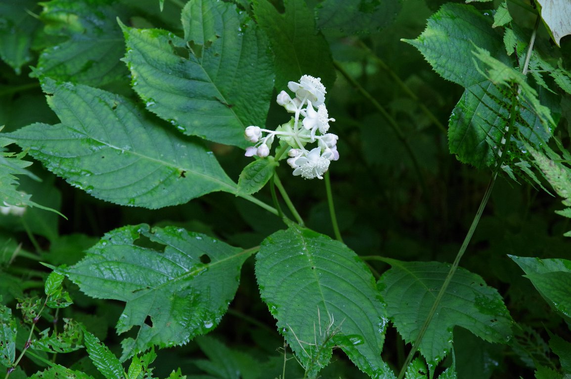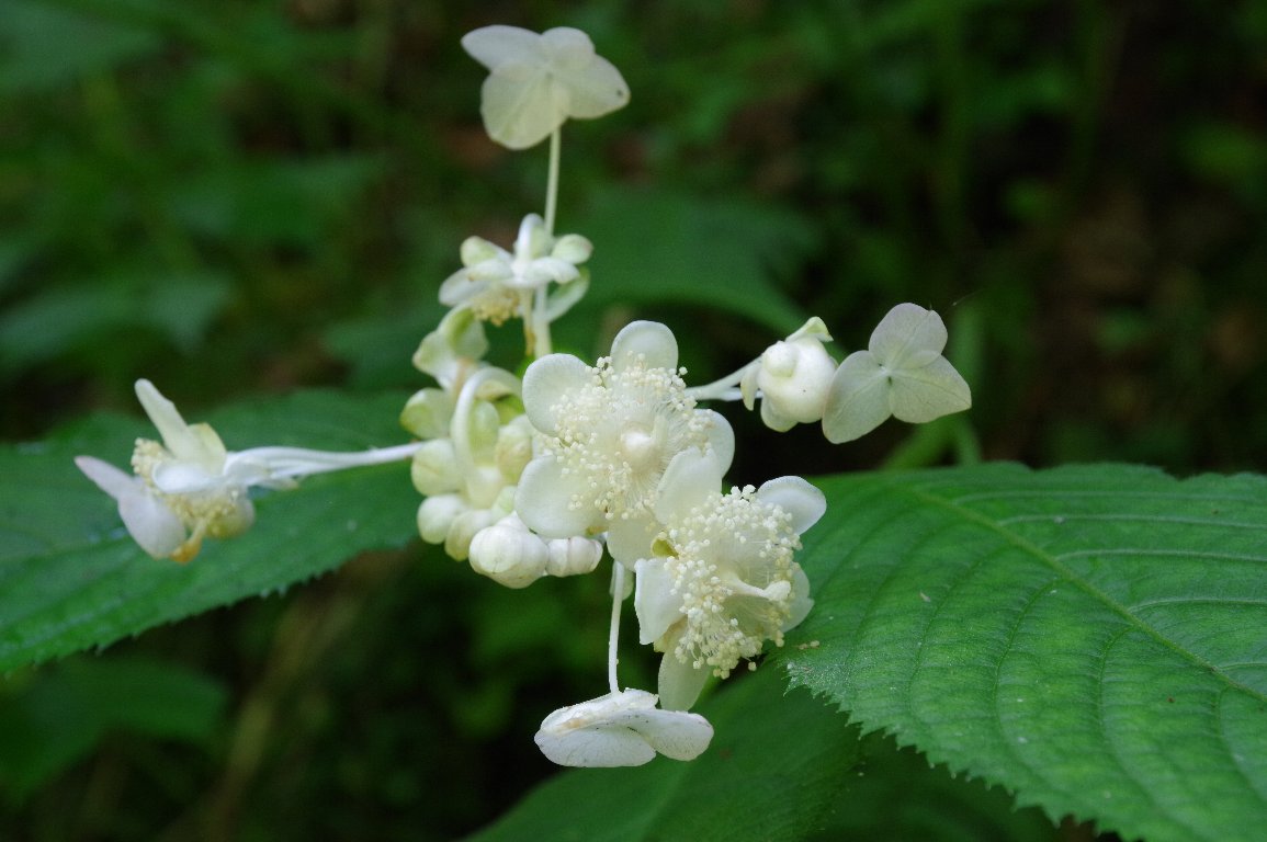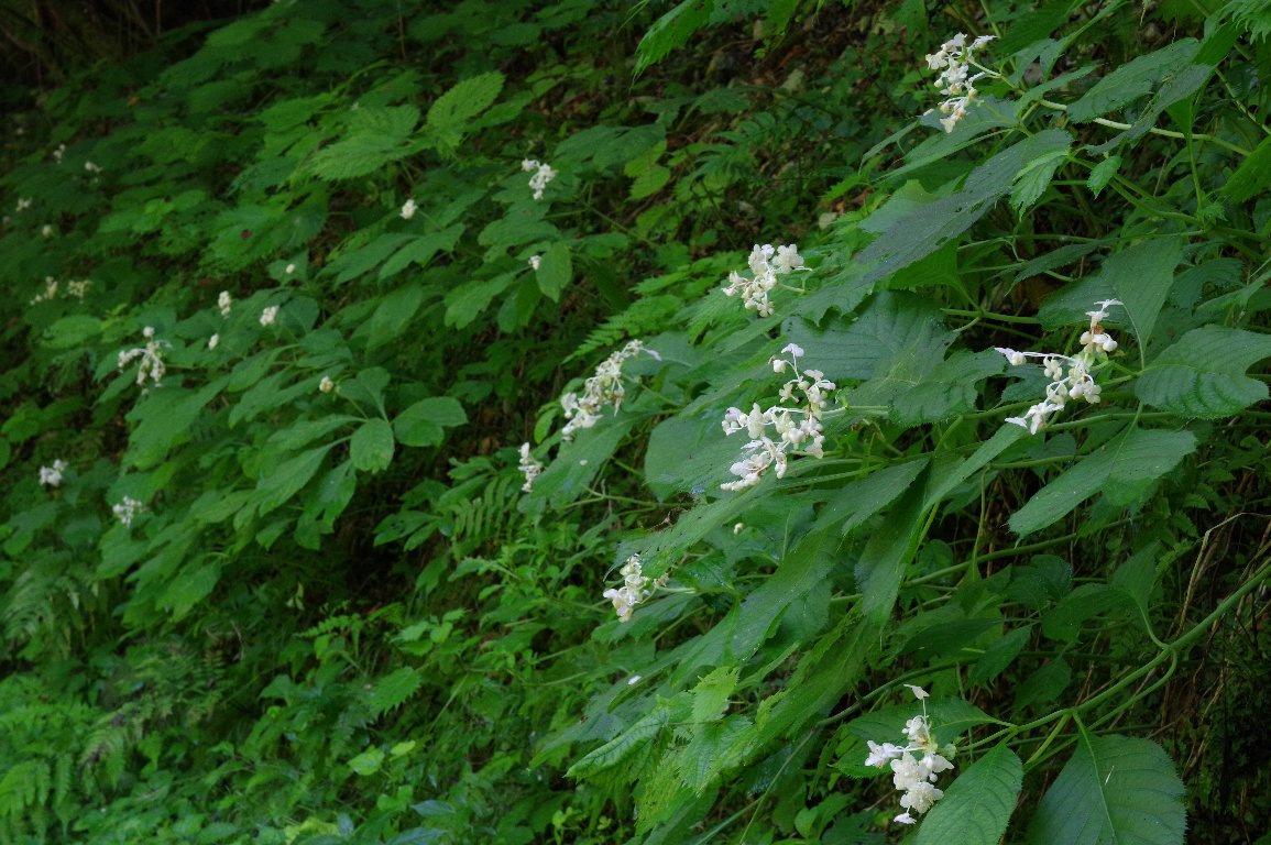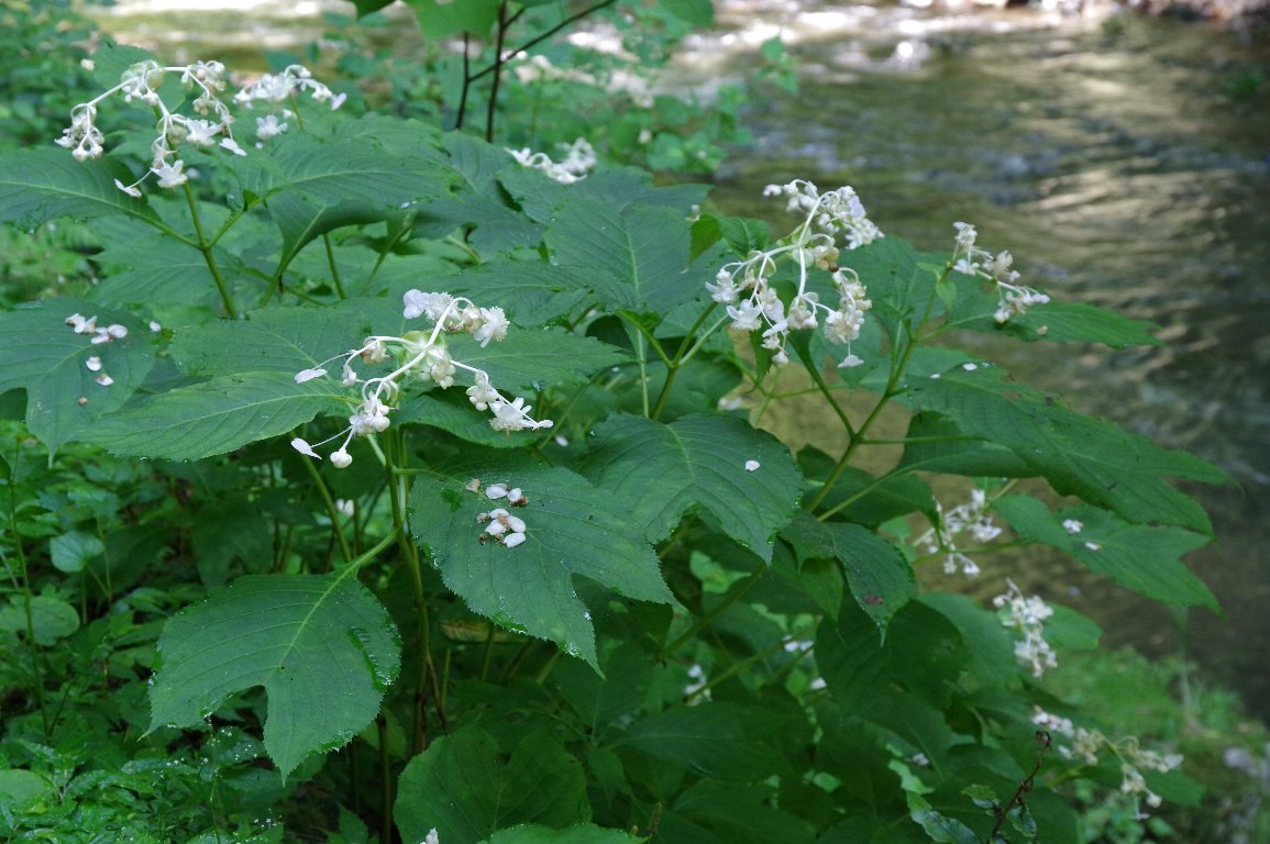 先が二股に切れ込んだ独特の形の葉っぱを広げ、真っ白な花を咲かせるギンバイソウ。 渓谷のほとりで咲いている姿を見ると、しばし、暑さを忘れさせてくれる。 |