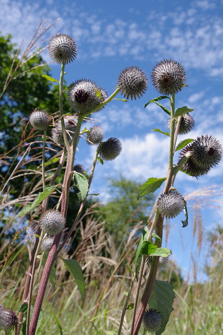 綿毛をまとったごっつい花だけど、どこかユーモラスなハバヤマボクチ。 まだまだ暑い秋空に向かって、元気いっぱいに咲いていた。 |