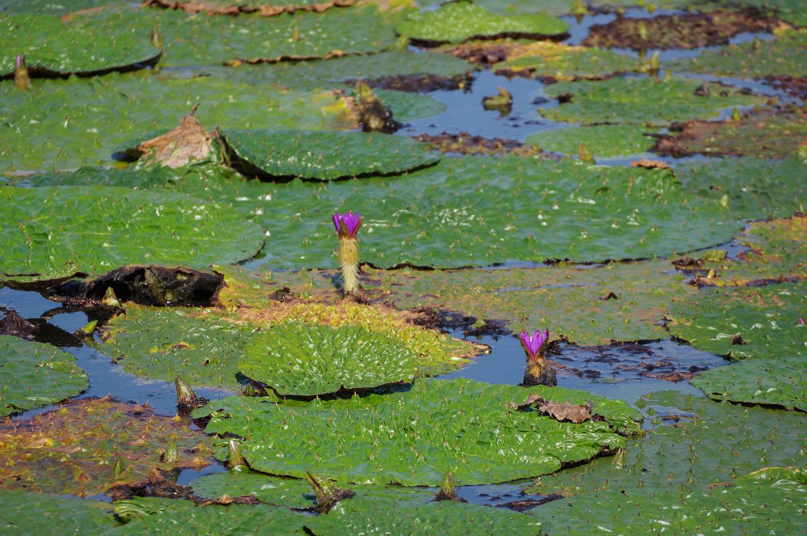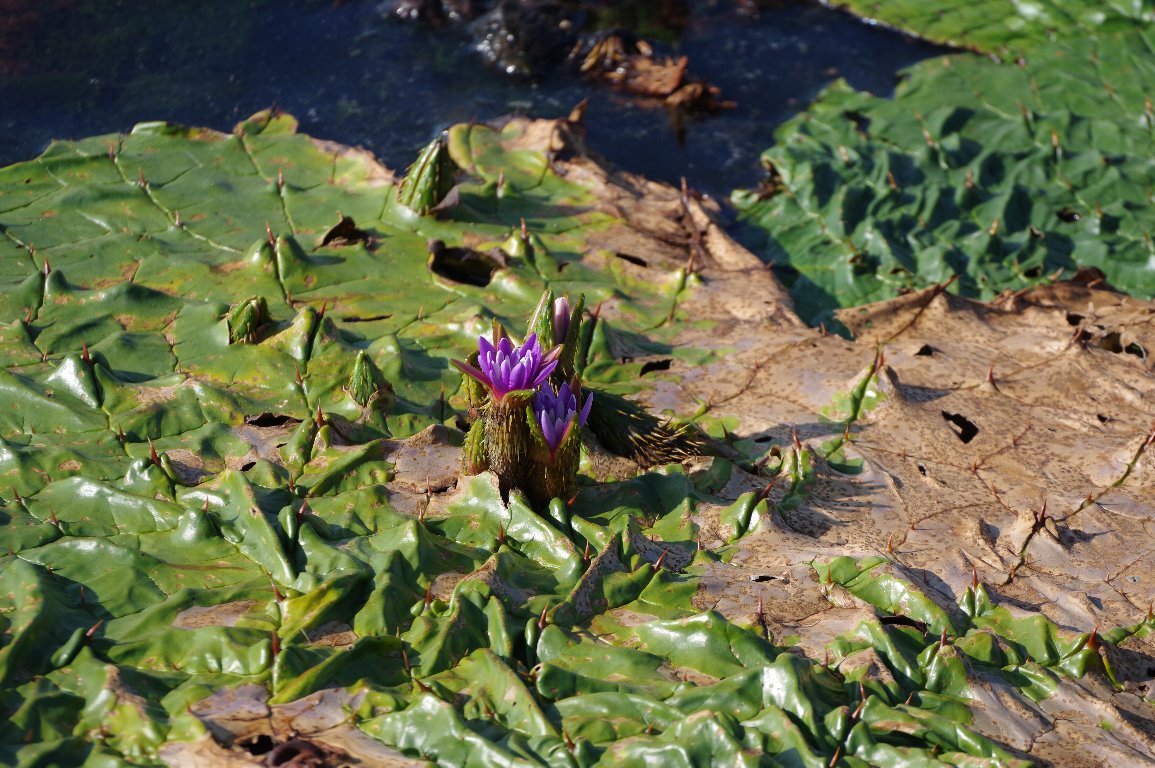 トゲトゲの大きな葉の間から、トゲトゲの茎をのばし、美しい紫色の花を開くオニバス。 ここのため池も、一時期は姿を消していたが、最近、復活し、今は保護活動もされているようで、 いちめんに茂って、花を咲かせていた。 |