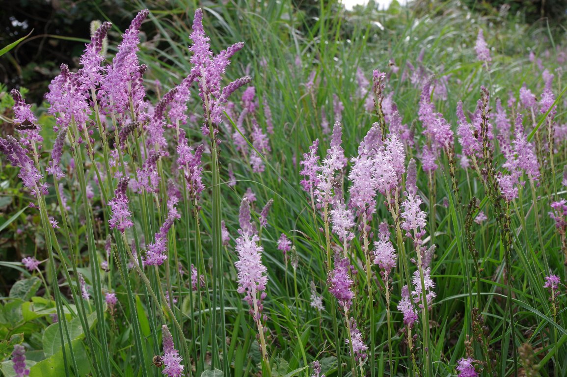 紀伊半島の海岸沿いは、秋の訪れが遅いとみえて、10月頭なのにツルボが花盛りだった。 桃色の花の穂を何本も伸ばし、密集して咲いているので、とても美しい。 そろそろ傾きかける午後の陽射しに、輝いていた。 |
