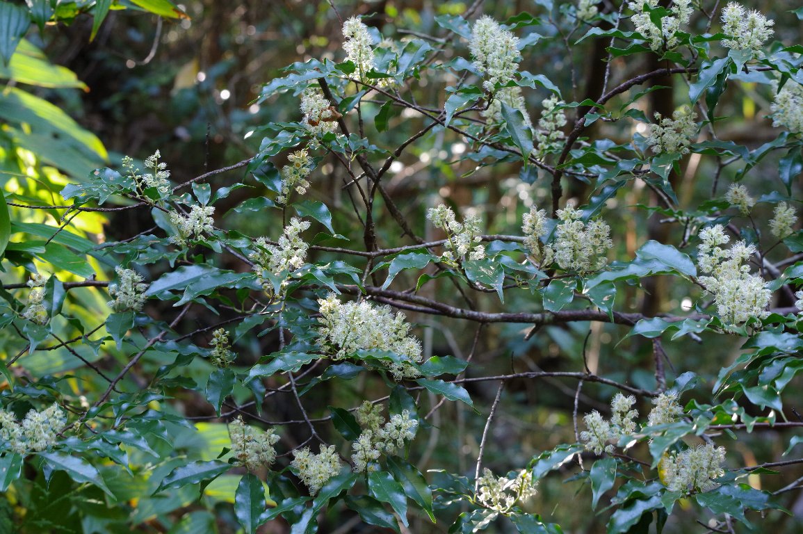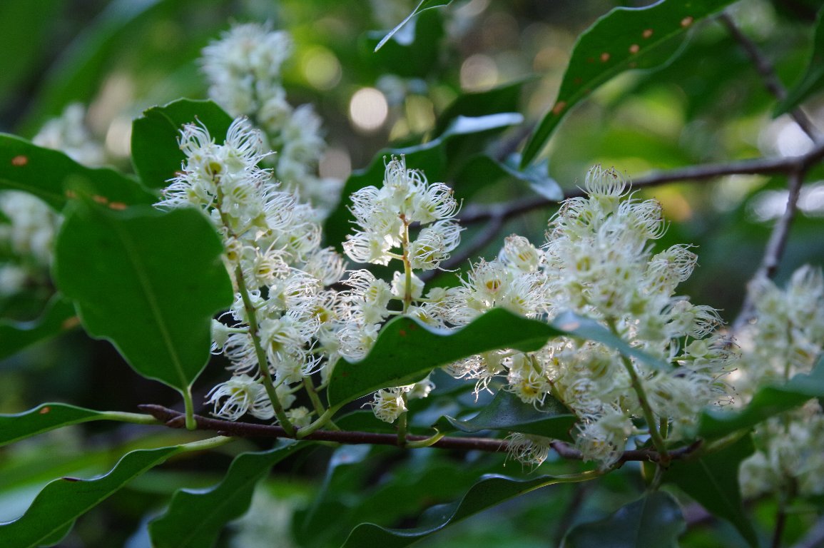 川沿いの常緑樹に、見慣れない白い花が咲いていた。リンボクだった。 大学に入って、植物を覚えたてのころ、先輩から教えてもらったが、花はなく、これがサクラの仲間とは、 到底、思えなかった。 今、花を見て、やっと、腑に落ちた思いだった。 |