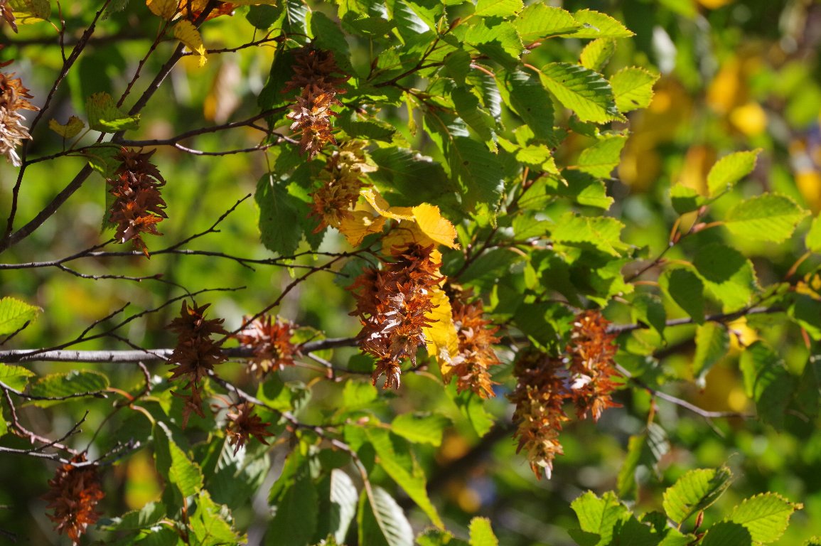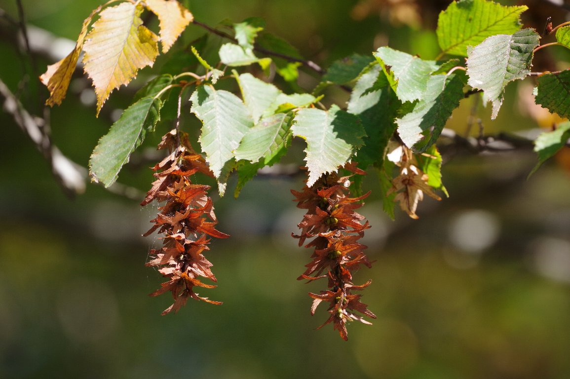 秋、紅葉前のアカシデ。名前の由来になった、紙で折られるシデ(紙垂)に似た実が、幾つもぶら下がっている。 やがて、風に吹かれて、舞い落ちるのだろう。 |