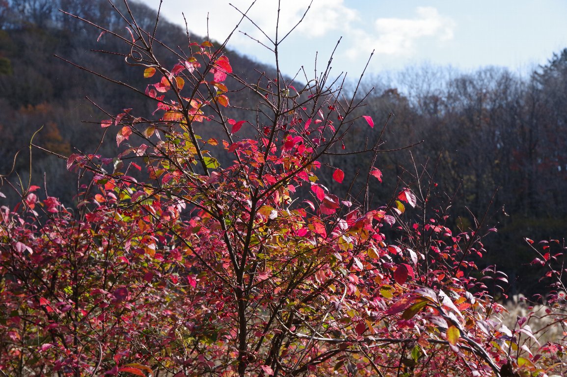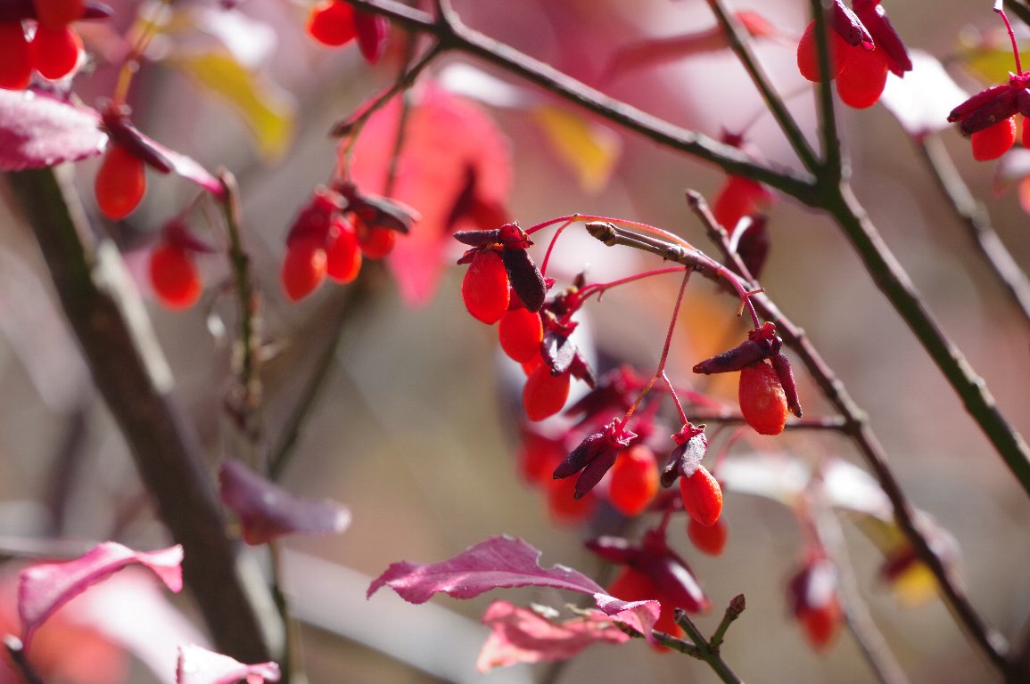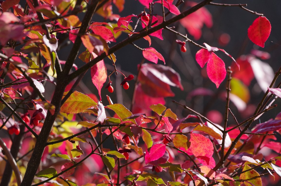 鮮やかな朱色の実をつけた小さな木があった。 コマユミだ。陽の光を受け、赤い宝石のように輝いていた。 |