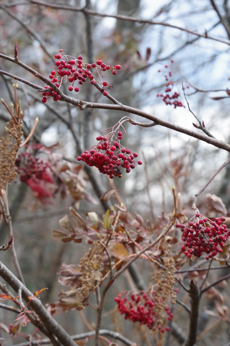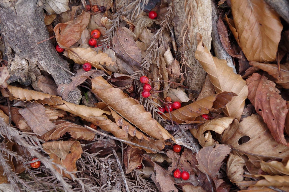 撮影雑記: 2018年の10月に、蘇武岳の林道沿いて、たわわに実っているナナカマドの実を見ました。その時は、葉っぱは、 まだ緑色でした。 次は、紅葉したナナカマドを見ようと、2023年11月に訪れてみたのですが、残念!すでに、葉っぱは散っていました。 ![]() 赤い実は、なんとか残っていました。 ![]() でも、実の表面が少し縮れています。もう、霜にも当たっているのでしょうね。 ![]() 盛り土になっている道の反対側の斜面を見ると、つやつやの実のナナカマドがありました。 でも、なんか、様子が変。実の向きがおかしい? ![]() なんと、そのナナカマドの木は、根もとからぽっきり折れて、倒れていました。僅かに、皮がつながっているだけです。 倒れたせいで、生っている実が、あさっての方向を向いてしまっていたのです。 まだ、老木でもないのに、何があったのでしょうか。 ![]() 倒れた木の下には、赤い実が、幾つもこぼれ落ちていました。 この木は、もうじき枯れてしまうと思います。でも、地上に落ちた実のどれかが芽を出し、根付いて、新たなナナカマドの 木に育ってゆくことでしょう。 |