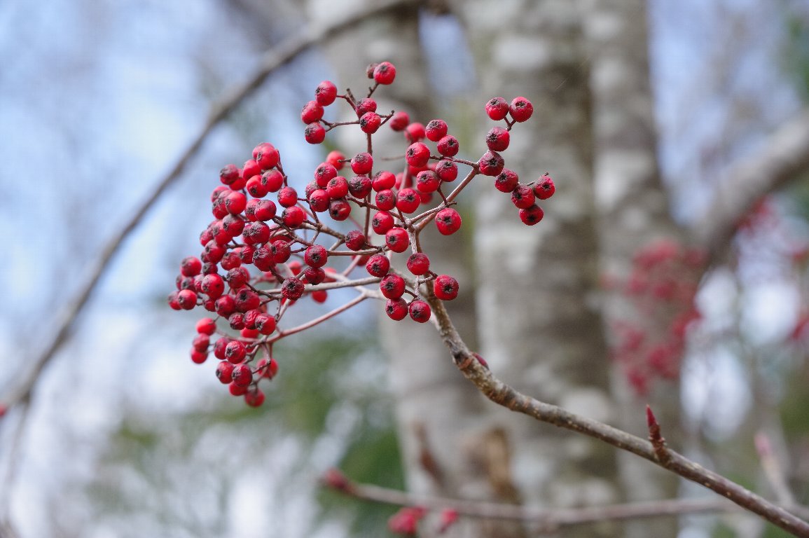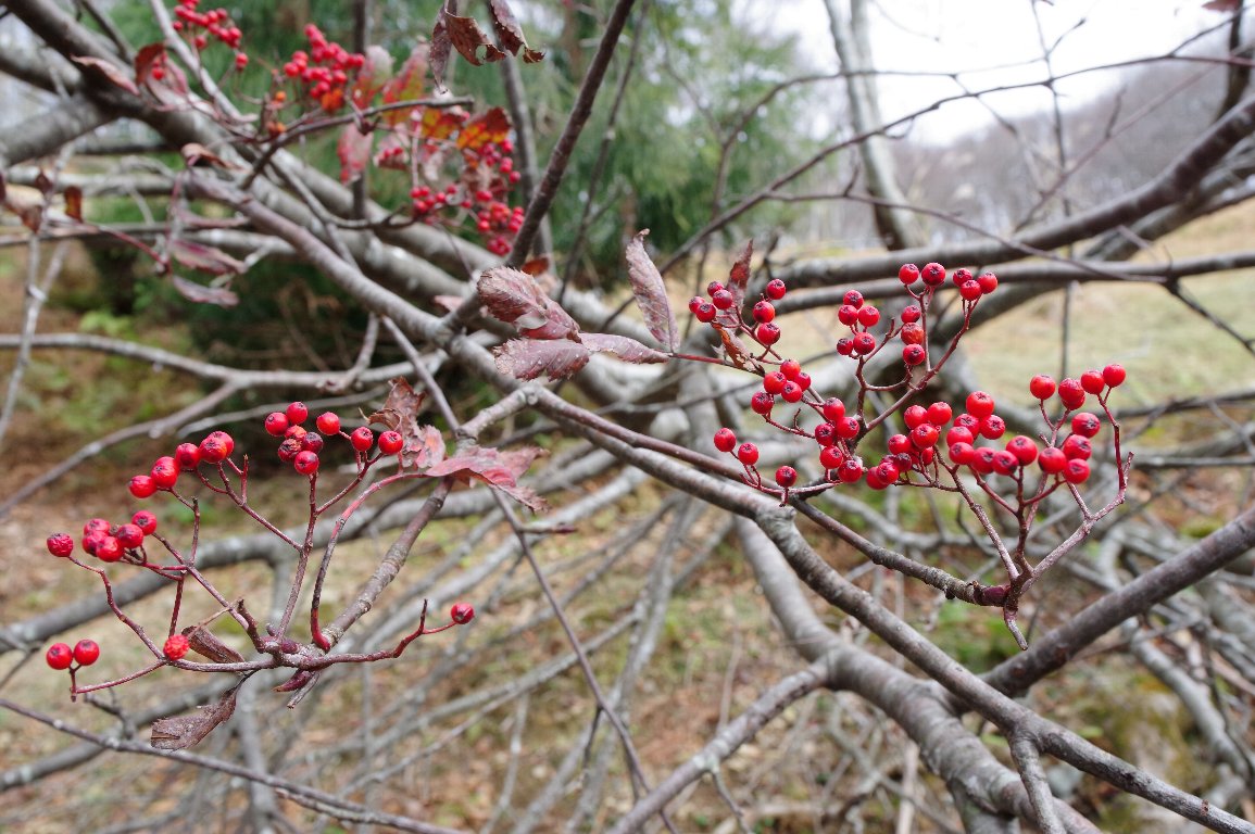 蘇武岳のナナカマドの紅葉が見たかったが、ちょっと遅かった。 赤い実は、まだ生っていたけど、少し萎れ気味。 と、つやつやの実を見つけた。でも、なんか様子が。そのナナカマドは、根もとから折れていた。 |