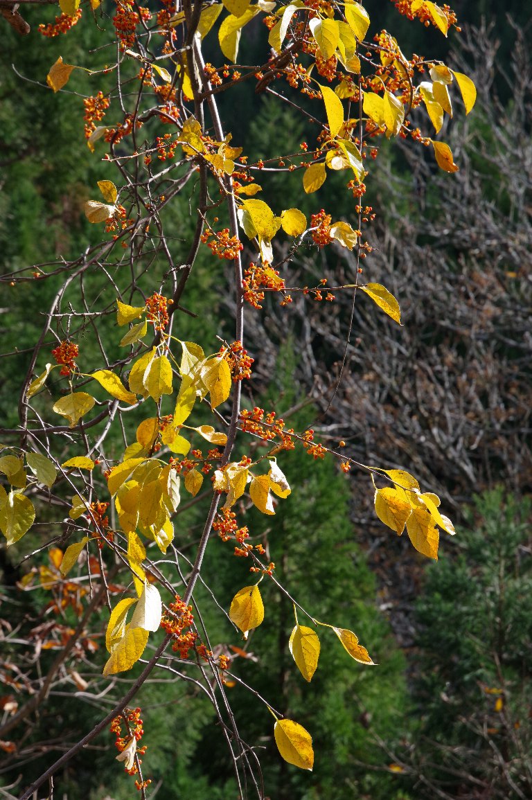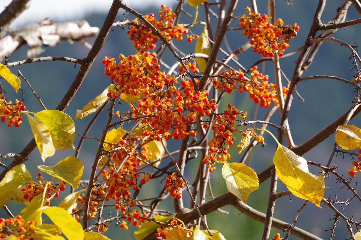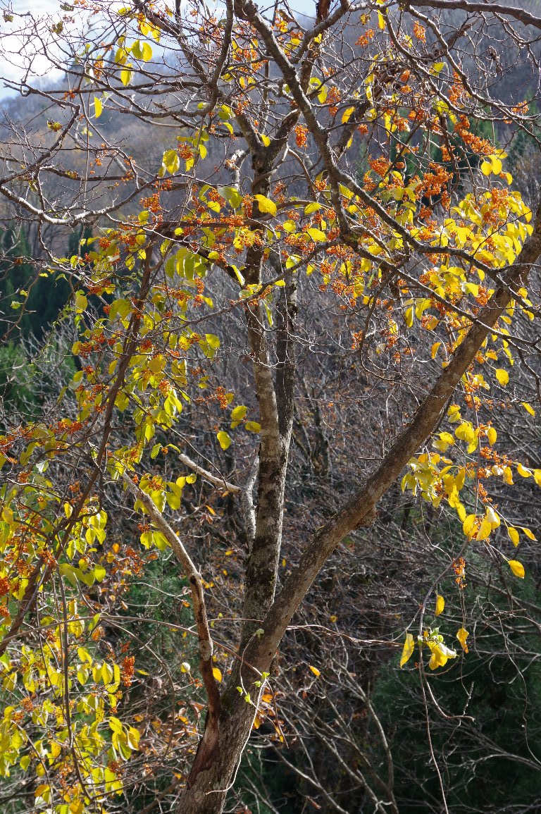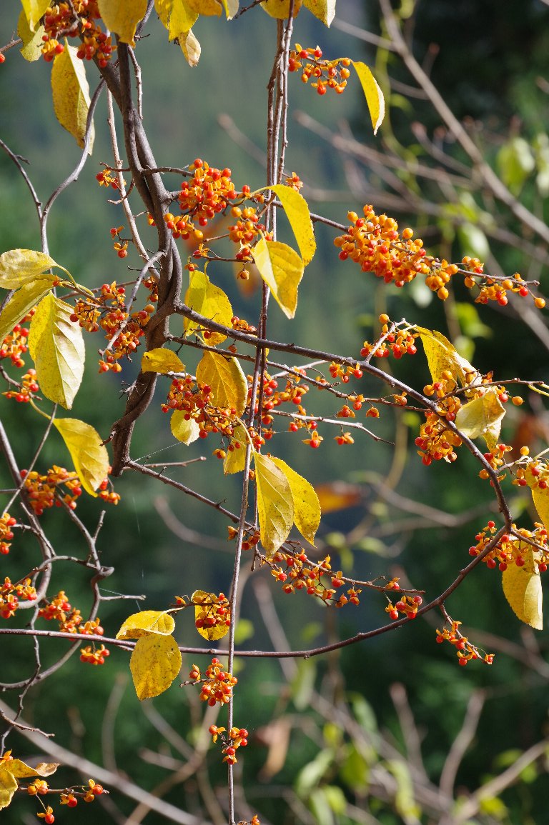 見晴らしの良い林道のカーブで、黄色の葉と、橙色の実が輝いていた。 木の枝に絡まって伸びる、ツルウメモドキだ。 葉を落とした実だけの姿も美しいが、黄葉と一緒の姿も格別だった。 |
