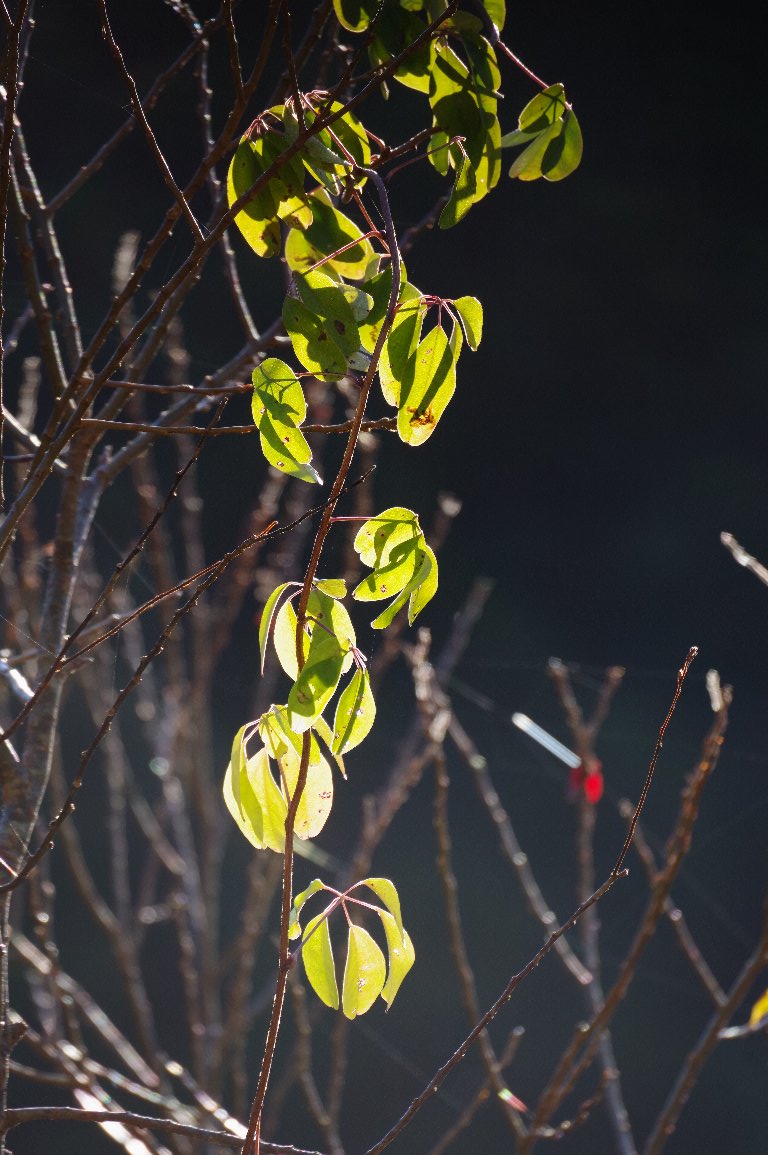 枝に絡んだ丸っこい葉っぱが、低い日差しに照らされて、輝いていた。 なんだろうと思って近づくと、アケビの葉だった。 冬の日に見つけた、ささやかな宝石。 |