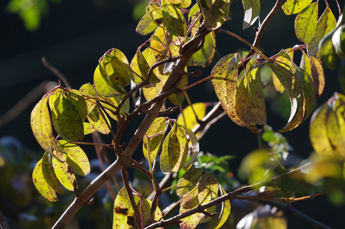 撮影雑記: 咲く花もなく、紅葉もあらかた終わった12月ですが、この季節ならではの、楽しみな被写体があります。 早朝ならば、霜が作り出す、白い芸術。その景色を見るため、寒い中、早起きもします。 昼間であれば、低い日差しに照らされた、葉っぱ、枯れ葉、木々の枝などの、ちょっとした表情がおもしろい。 そして、こんな、素敵な景色に合えました。 ![]() 輝くアケビの葉が、まるで、ぶら下げられた宝石のよう。 後ろに、ルビーのように、ポチっと赤く光っているのは、枯れ残った何かの紅葉でしょう。 ![]() こちらは、別のアケビの葉。 少し、傷んだ感じのポツポツがありますが、それもまた、一興です。 |