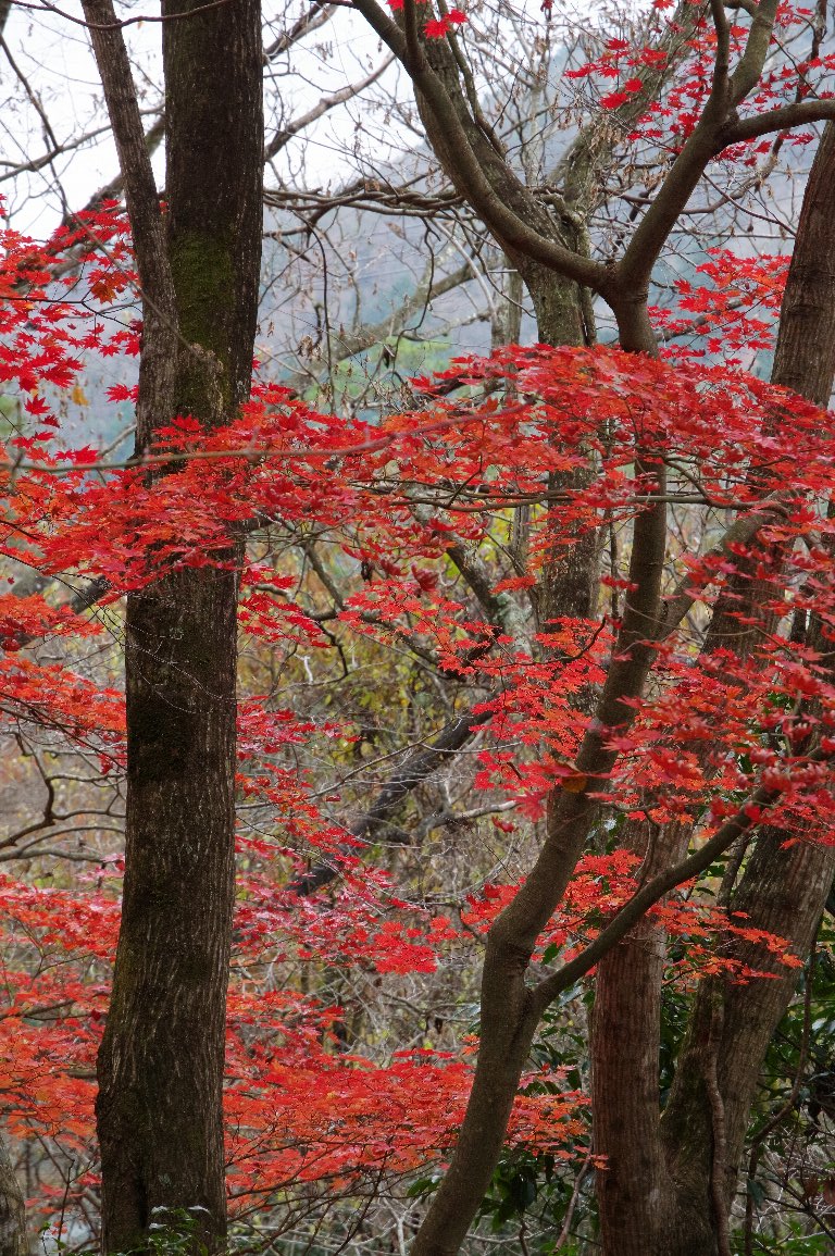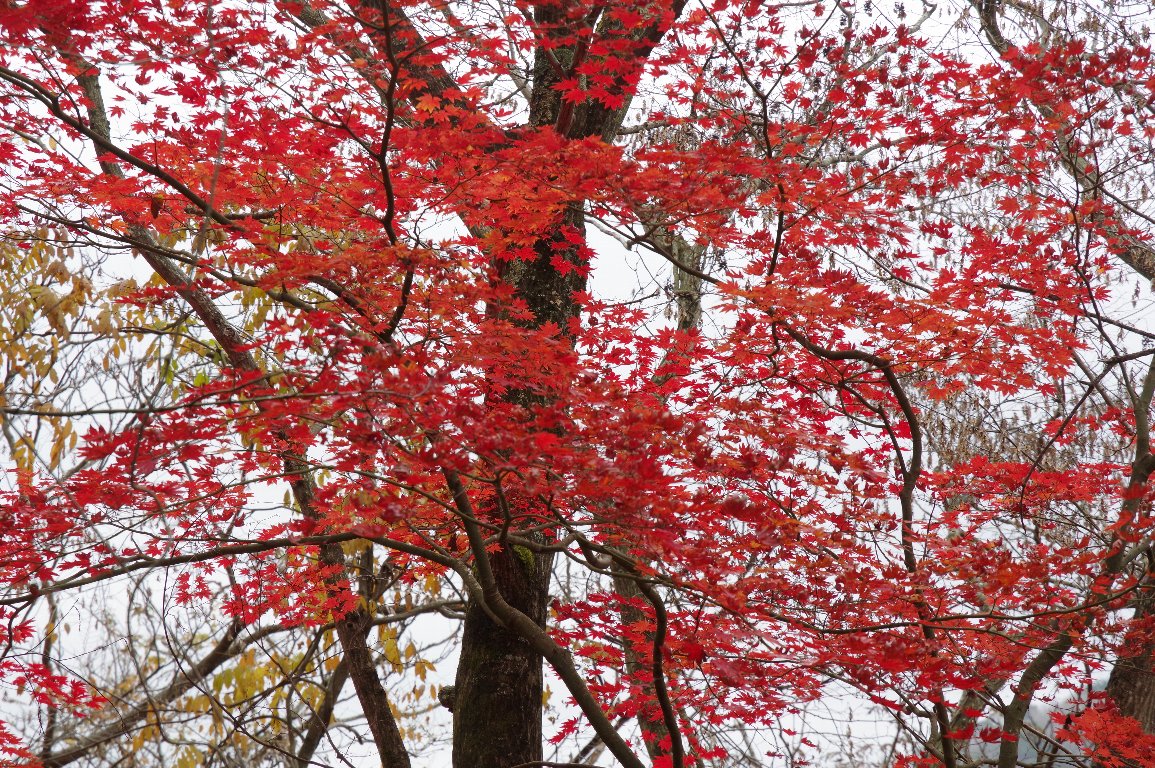 あらかた葉を落とした雑木林で、ひときわ目を引く真紅の紅葉(もみじ)。 なんだろう?カエデ仲間は種類が多くて、見分けが難しい。 いろいろ調べた結果、コハウチワカエデと思うが、合ってるだろうか? |