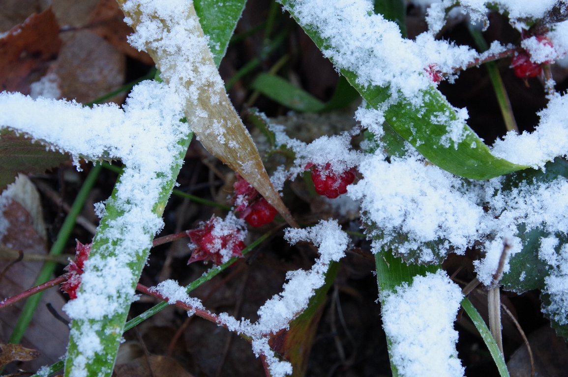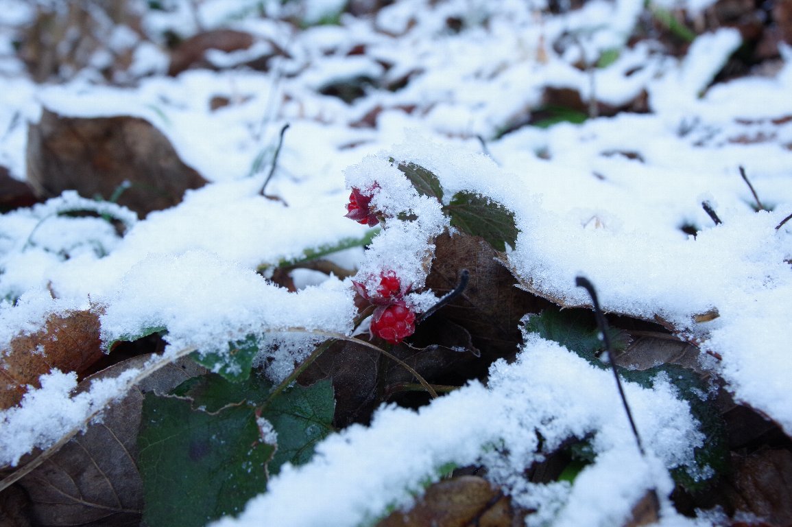 撮影雑記: 宝塚市に越してきて、丹波篠山方面を巡るようになりましたが、冬場は、思ったより、雪が多いです。 でも、ここ最近、徐々に、雪が少なくなっている気がします。 この日は、うっすらと、雪が積もっていました。 ![]() フユイチゴのある場所に行ってみると、すっかり覆われてはおらず、ところどころ、赤い苺が顔を覗かせていました。 ![]() 草の間に、隠れるように生っている、フユイチゴ。 とっても寒そうでした。 |