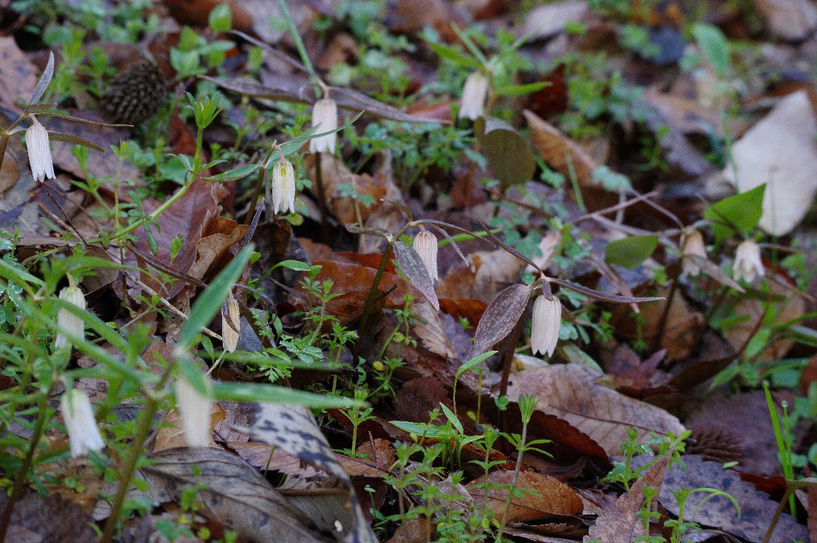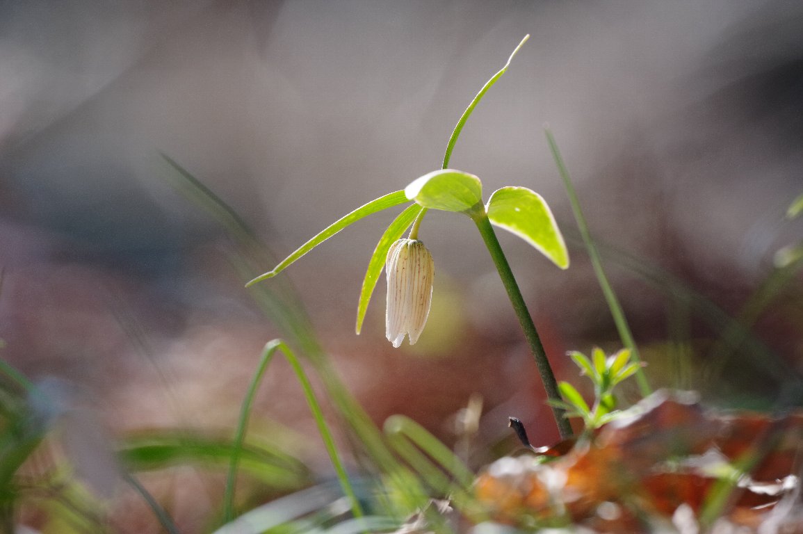 去年はタイミングを逃してしまった、ホソバナコバイモ。 今年こそはと自生地を訪れると、山の斜面でうつむいた小さな花が、幾つも出迎えてくれた。 |