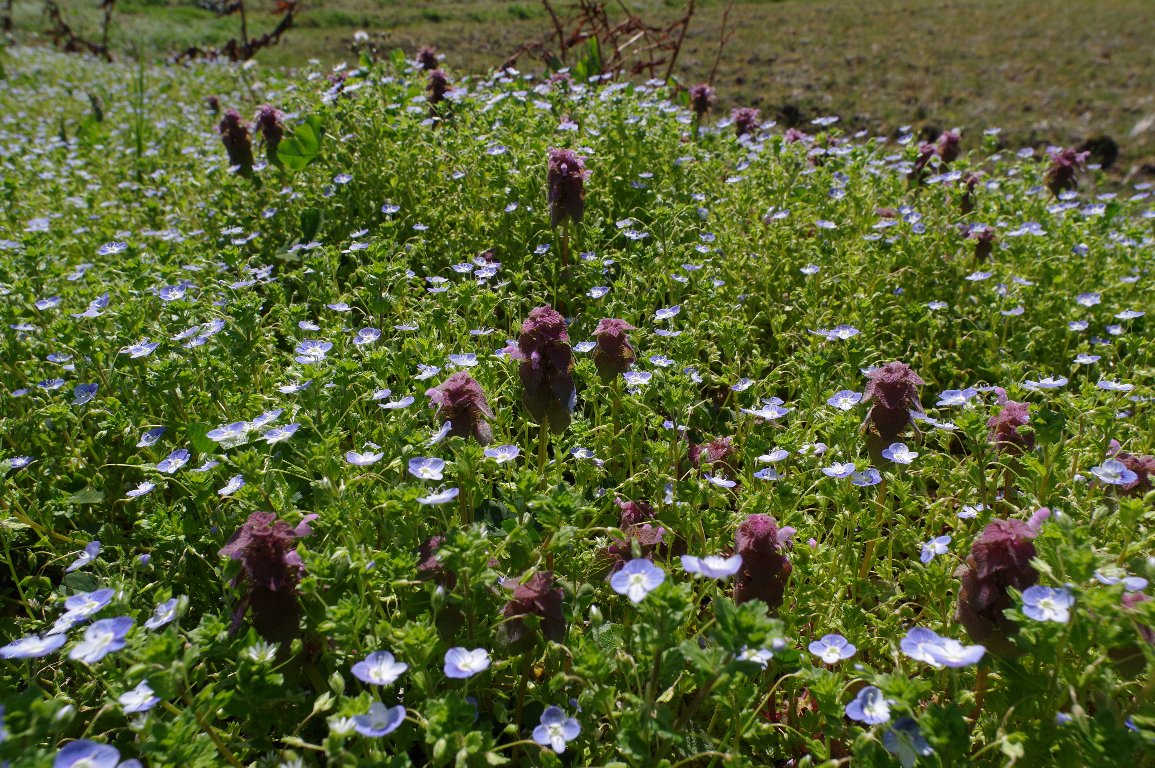 田んぼの土手いっぱいに散りばめられた、瑠璃色の宝石のような花、オオイヌノフグリ。 意外と強い春分の頃の日差しを、一身に受けていた。 |