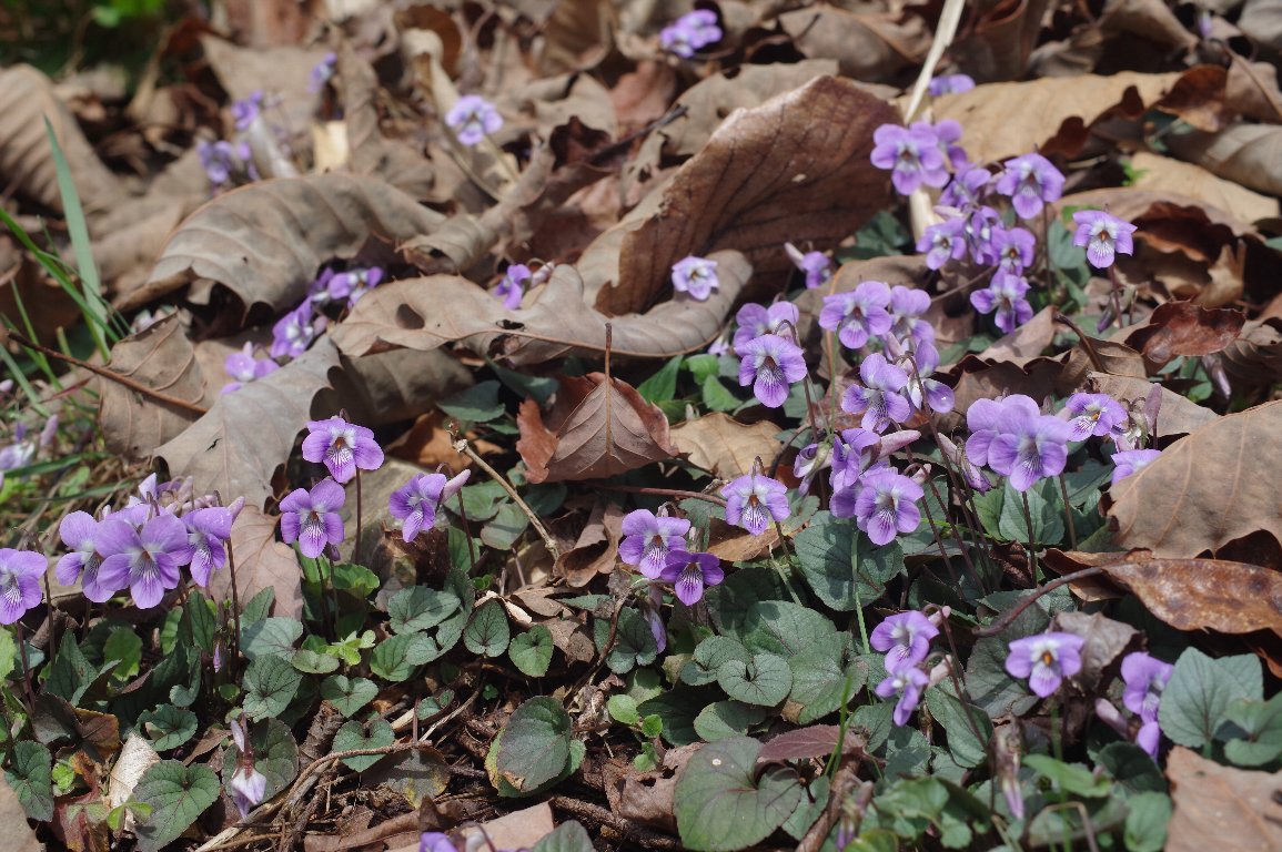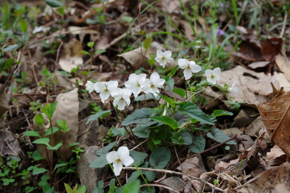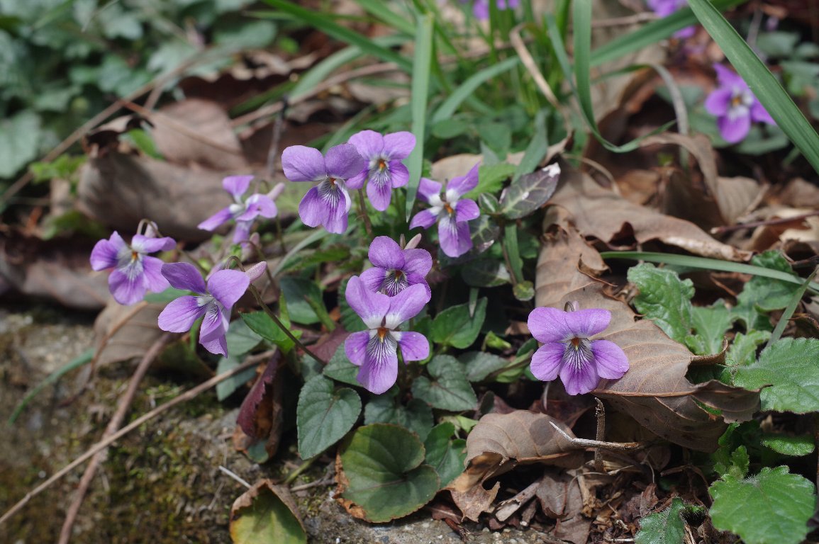 道端の落ち葉の中に咲く、スミレの一団を見つけた。 ナガバタチツボスミレだ。兵庫や岡山あたりでは、ふつうに見られる。 花が終わった後に、名の由来になった、細長い葉が伸びてくる。 |