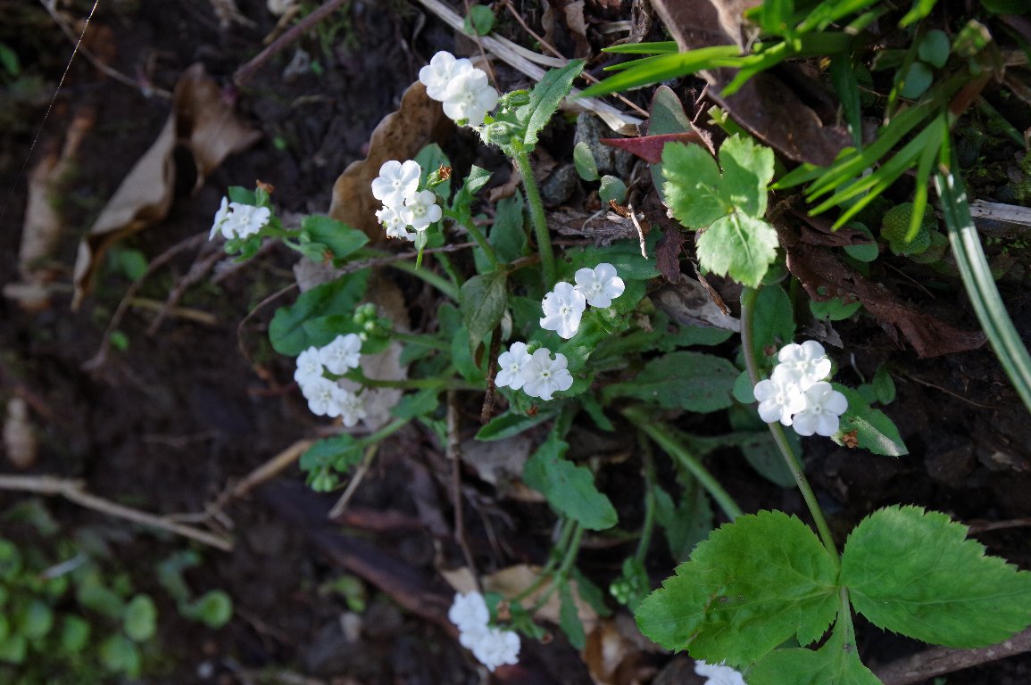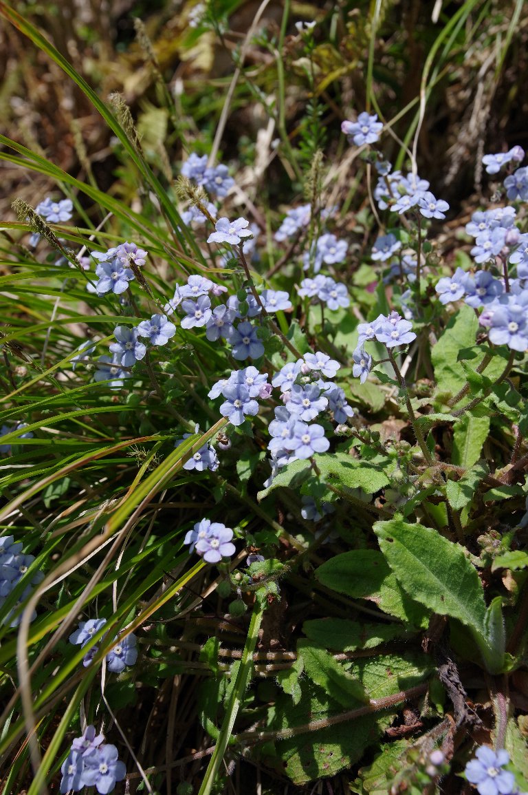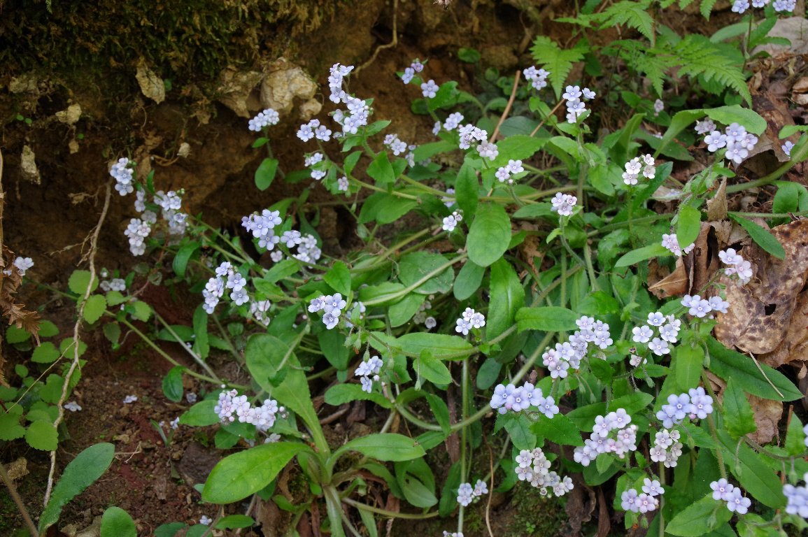 山の道端の斜面でよく見かける、ヤマルリソウ。 僅かに紫がかった水色の花が、美しい。 この時は、スゲの隣に、大きな株になって咲いていた。 |