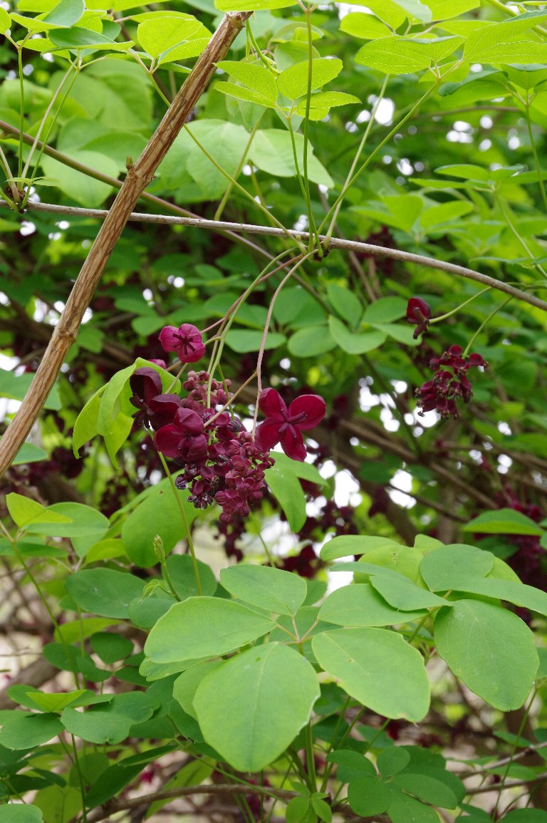 撮影雑記: アケビとミツバアケビの雑種のゴヨウアケビ。 その存在は知っていましたが、はっきりとこの目で見たのは、初めてかもしれません。 ![]() トップと同じ花を、縦構図で撮ったものです。 こちらの方が、咲いている様子がよくわかります。 ![]() びっしり枝に絡まって、うじゃうじゃ咲いていました。 ![]() 花のアップです。 姿かたちはアケビ、色あいはミツバアケビ。そんな感じの花です。 ![]() 参考までに、これがミツバアケビです。 併せて見ることで、ひとつ前で紹介したアケビと、このミツバアケビの中間の特徴を持つことがよくわかると思います。 |