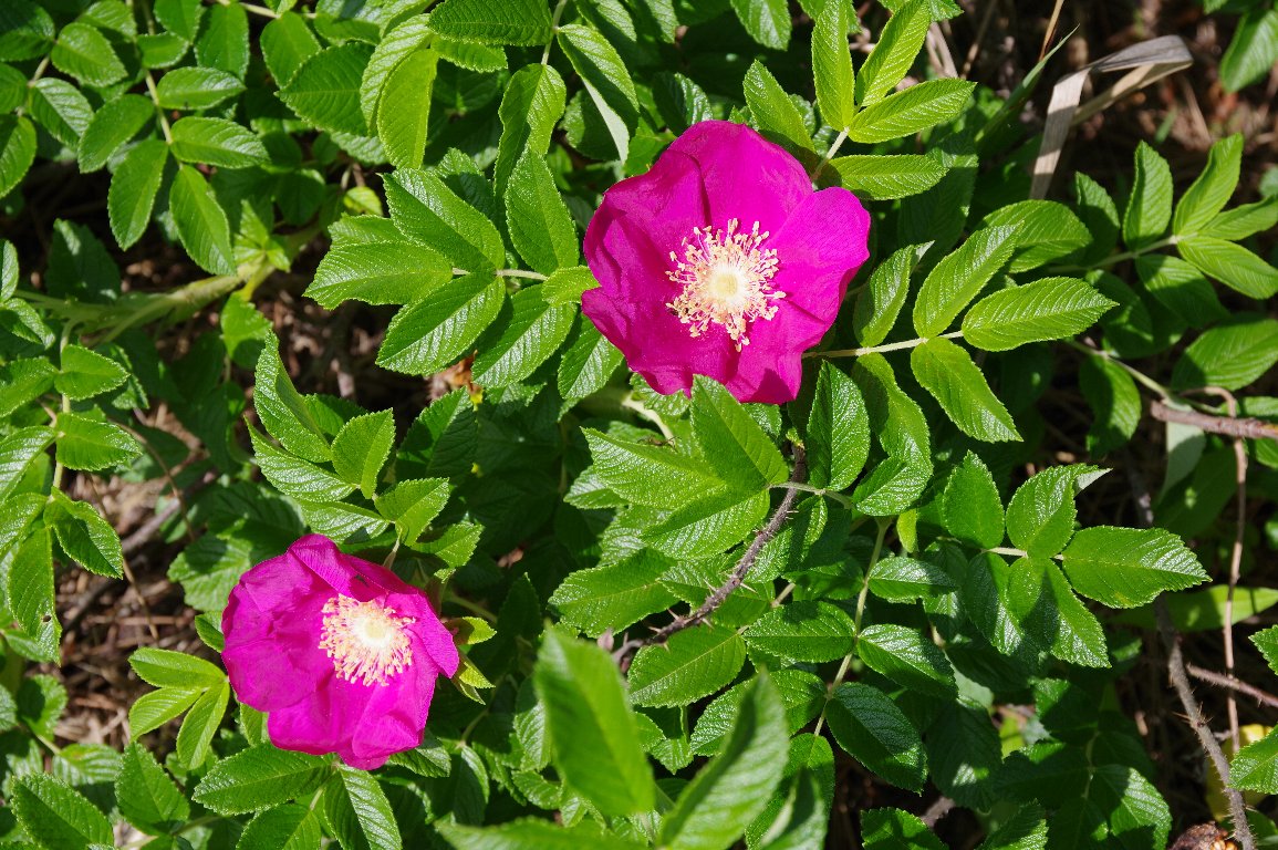 浜辺で、ハマナスの濃いピンクの鮮やかな花を見ると、ハッとする。 初夏の強い日差しを浴びつつも、それに負けないオーラを放っていた。 |