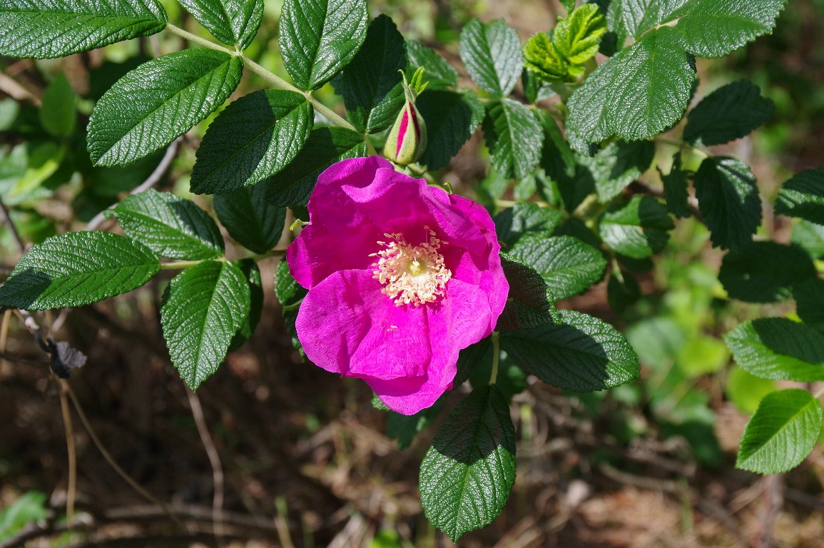 撮影雑記: ハマナスの花を見ようと、丹後の浜辺にやって来ました。 期待したより、咲いている花数は少なかったですが、きれいな花に会えました。 ![]() 緑の葉を広げ、大き目の、鮮やかな濃いピンク色の花。 どうしたら、こんな色を出せるのだろうって思います。 ![]() 咲いている花の脇にはつぼみが。 いっぽう、冒頭の写真では、既に、実が生っていました。 花期が長く、順々に咲いて、順々に実っていくのでしょうね。 |
