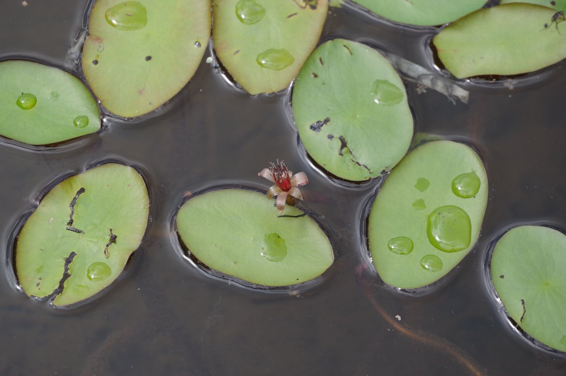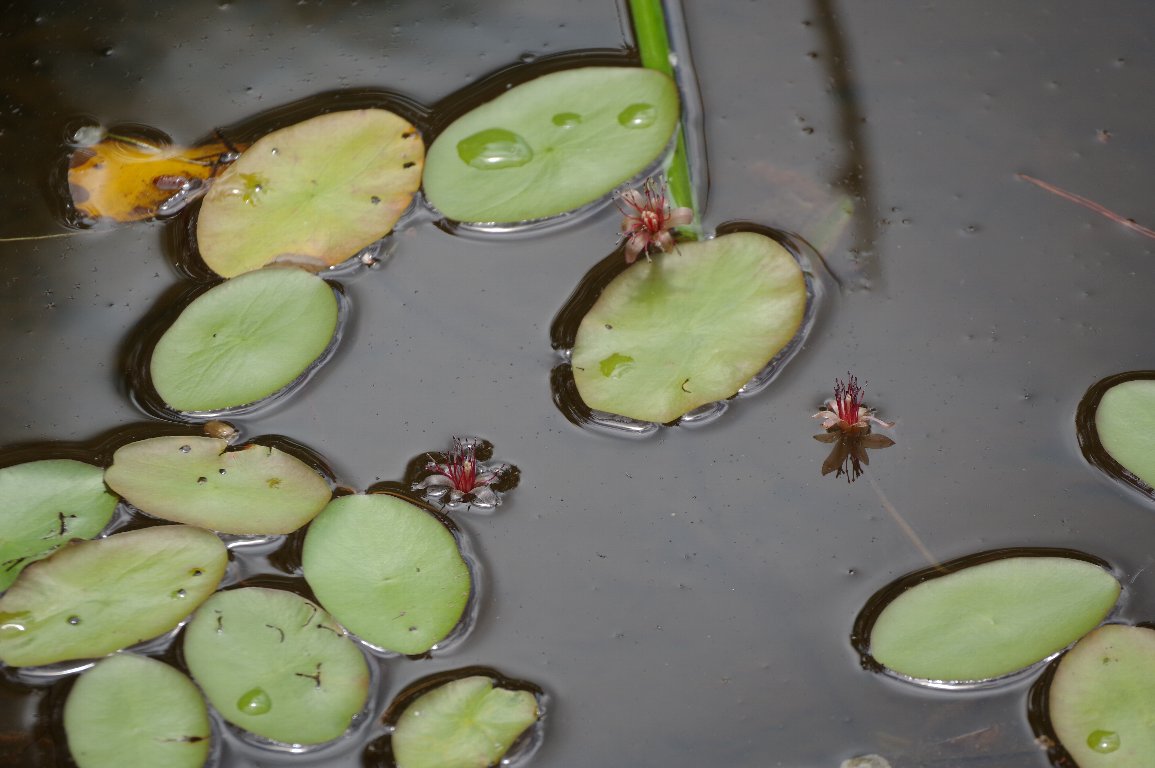 楕円の葉の間から顔を覗かせている渋めの赤い花は、ジュンサイの花だ。 ぬめりのある独特な野菜のジュンサイは、こんな花を咲かせるのです。 |